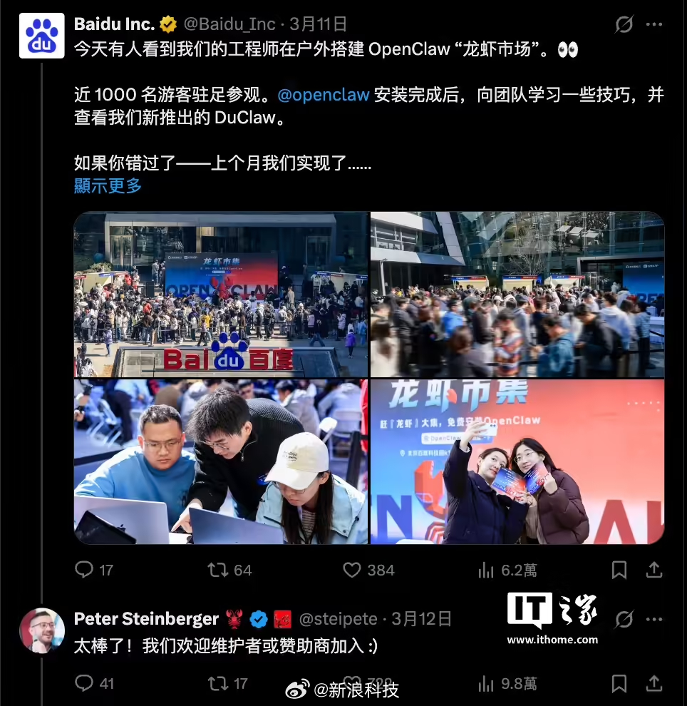 彼得 · 斯坦伯格对此表示,这些活动非常棒,他们欢迎维护者和赞助商加入,并喊话道:“你觉得百度能否也为 OpenClaw 的开发提供支持,而不仅仅是部署?”。