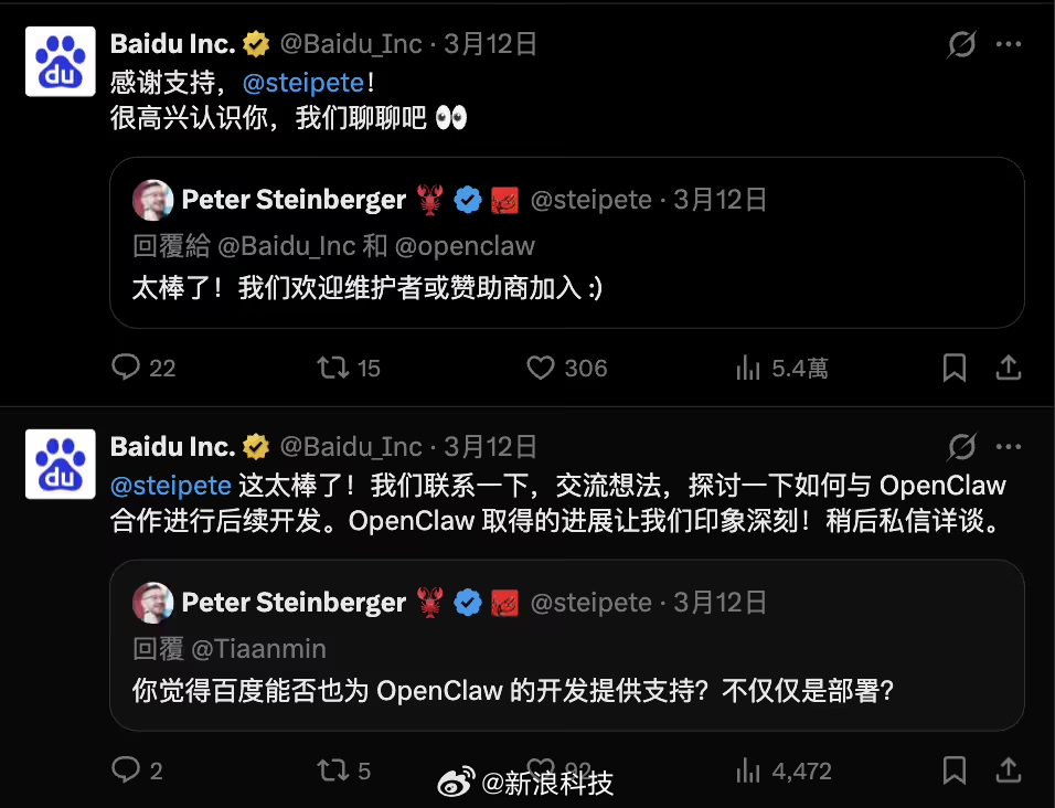 而百度方面则回应道,OpenClaw 取得的进展让他们印象深刻,希望与斯坦伯格联系一下交流想法,探讨双方如何合作开发 OpenClaw。