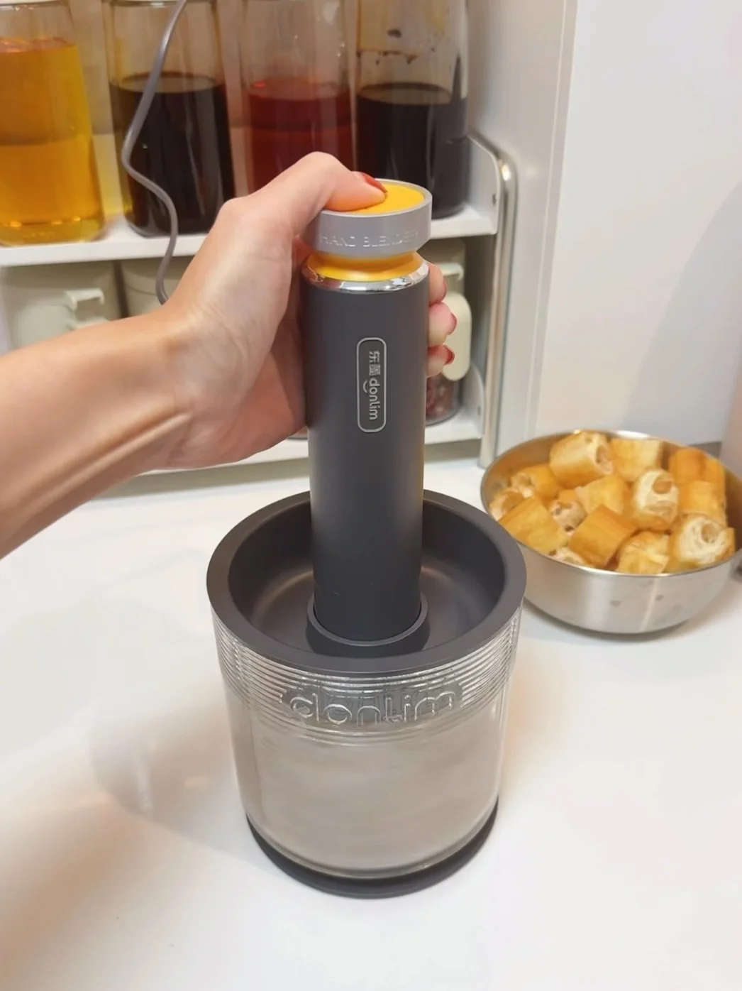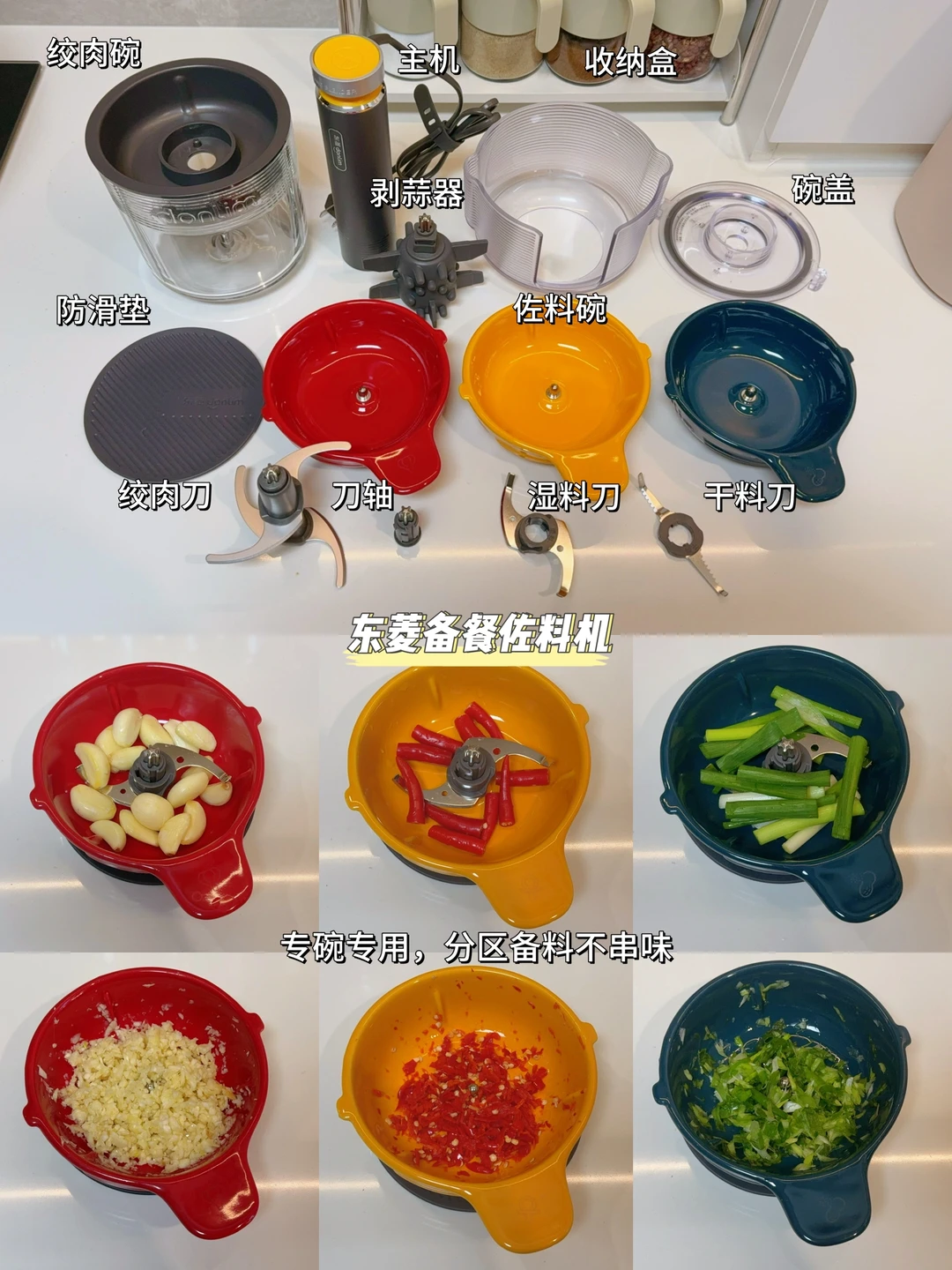 为了提高备菜效率,我入手了东菱备餐佐料机。一个可视的玻璃绞肉碗和三个耐高温陶瓷碗,专碗专用,分区备料不串味。三个刀头可用来绞肉、打湿料、打干料。干料的锯齿刀头还可以打胡椒这样的硬质食材。对于我这样不喜欢剥蒜的人来说,搭配的剥蒜器真的太实用了,剥出的蒜非常干净,终于不用沾的满手蒜味了。[斜眼R][斜眼R]