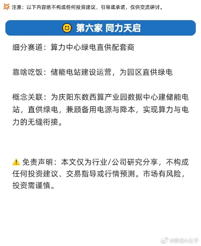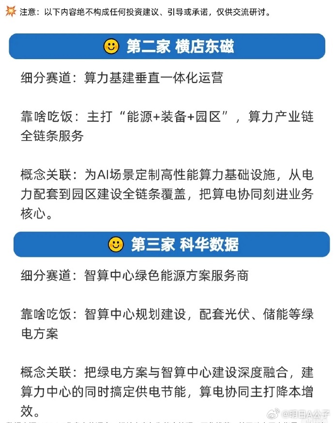 “算电协同”——即让高速发展的AI算力中心与电力系统深度融合,实现稳定供电与降低成本双赢。 六大代表性公司及其角色: 1. 中国能建:算力中心运营商,作为“东数西算”国家队,将电力业务与算力中心建设深度绑定。 2. 横店东磁:算力基建服务商,提供从能源、设备到园区的全链条一体化服务。 3. 科华数据:智算中心绿色能源方案商,将光伏、储能等绿电方案融入智算中心建设。 4. 中恒电气:高可靠电源设备商,通过HVDC电源技术保障算力中心稳定低耗运行。 5. 华自科技:源网荷储一体化服务商,利用电力调度优势打通算力网与电力网。 6. 同力天启:绿电直供配套商,通过建设储能电站为数据中心直供绿电,实现降本与无缝衔接。