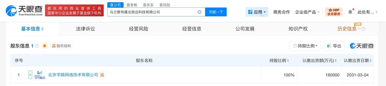 字节跳动在乌兰察布成立新科技公司 注册资本16亿 天眼查工商信息显示,近日,乌兰察布雁北致远科技有限公司成立,法定代表人为董佳建,注册资本16亿人民币,经营范围包括信息技术咨询服务、软件开发、信息系统集成服务等。股东信息显示,该公司由字节跳动旗下北京字跳网络技术有限公司全资持股。 天眼查信息:
