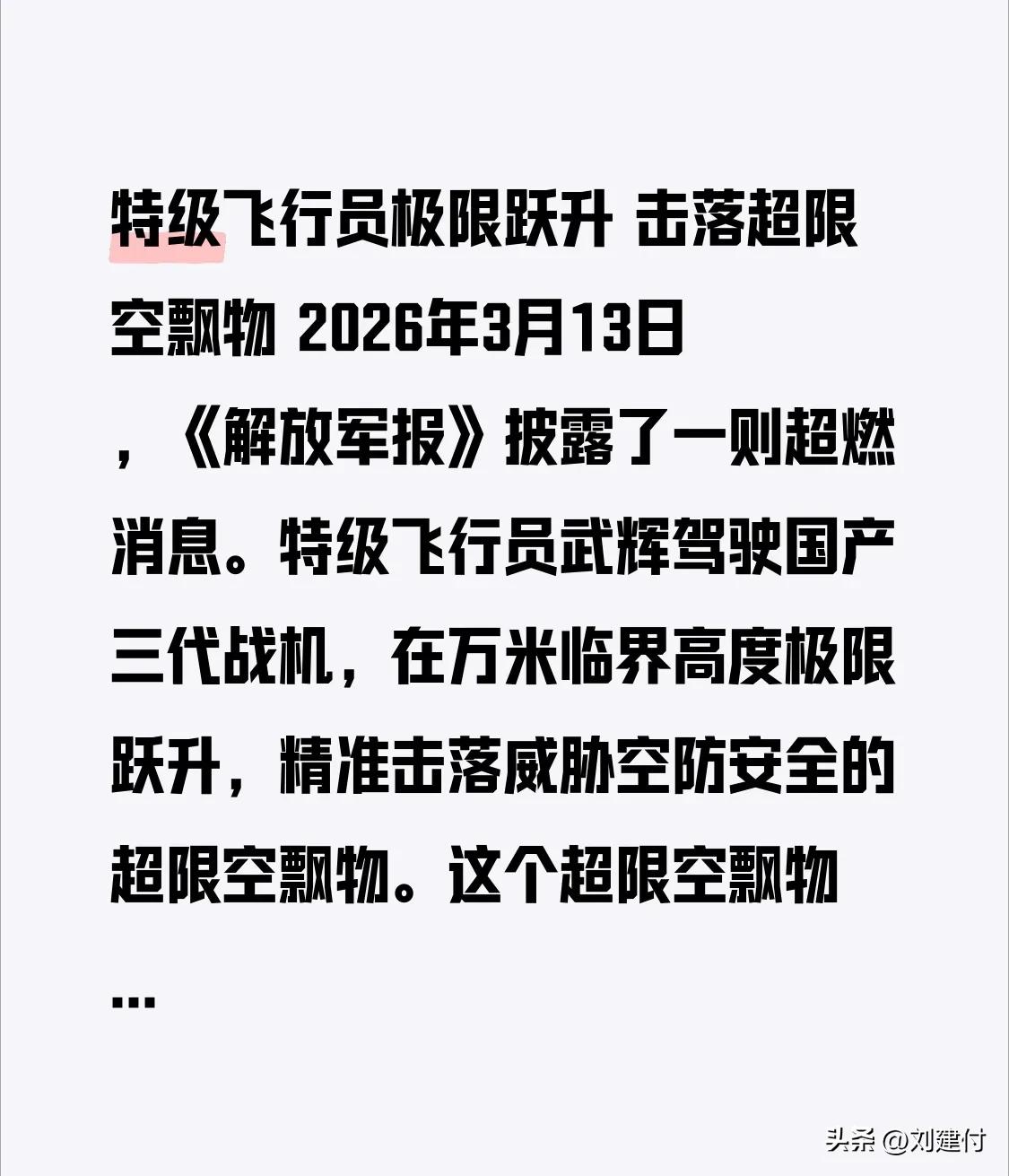 特级飞行员极限跃升 击落超限空飘物 特级飞行员极限跃升,击落超限空飘物 2026年3月13日,《解放军报》披露一则超燃消息。特级飞行员武辉驾驶国产三代战机,在万米临界高度极限跃升,精准击落威胁空防安全的超限空飘物。该超限空飘物飞行高度超1.5万米,雷达反射面小、轨迹飘忽,还疑似搭载侦察设备,对我国空防威胁极大。 武辉在无预案修正、无二次试错的实战条件下执行任务,这既是对他生理和心理极限的挑战,也是战机性能和战术战法的极限突破。这一教科书式的处置,彰显人民空军捍卫国家领空主权的硬核能力,为他们点赞! 东方战机 中国超音速客机 超音速教练机