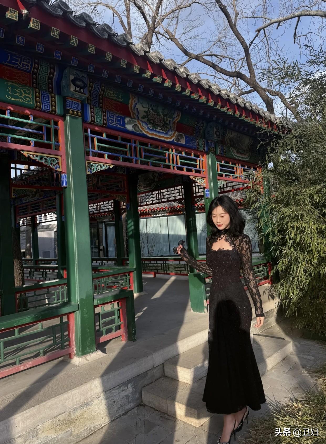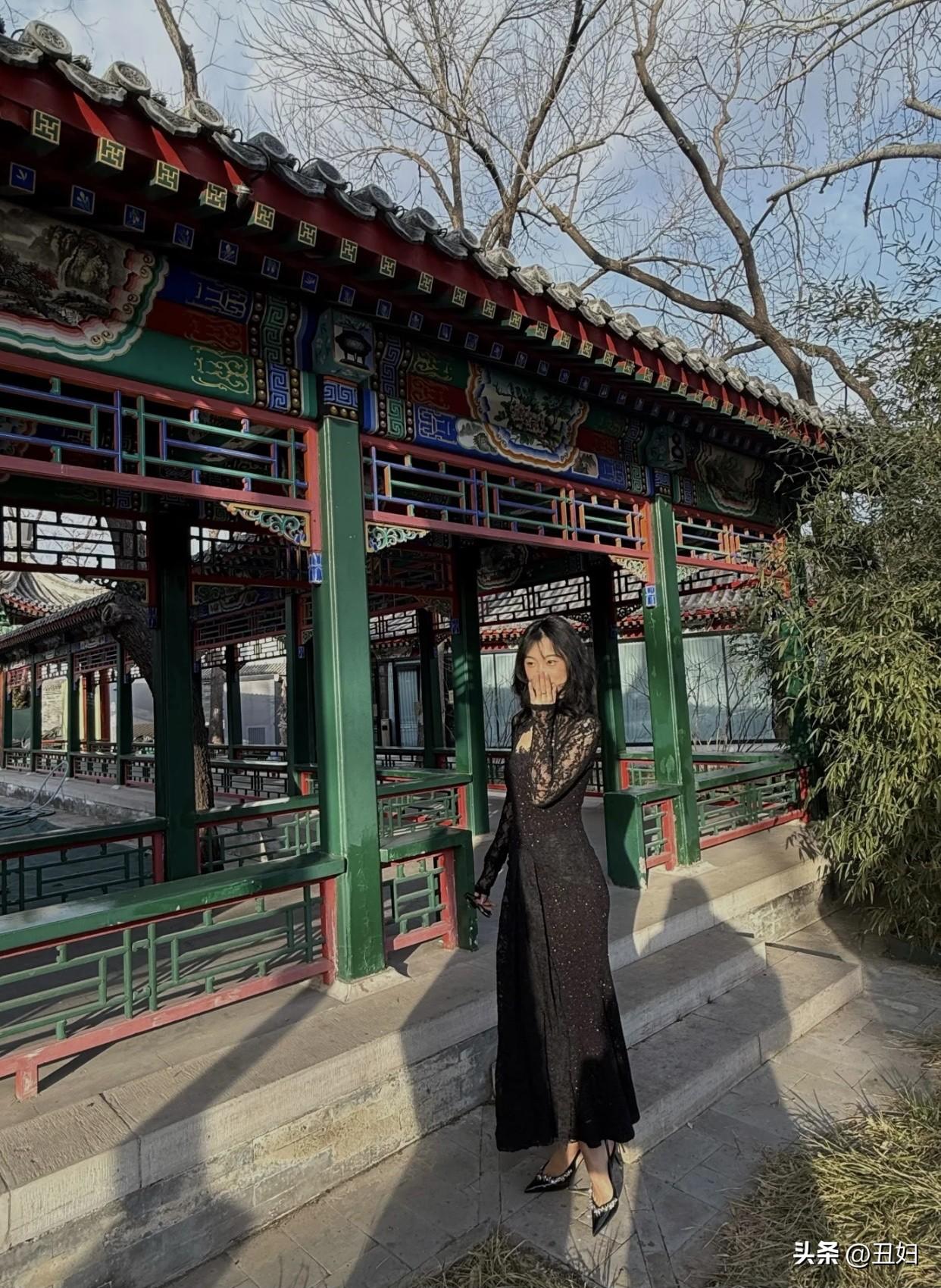 舒服又好看的穿搭有哪些古典园林中的时尚女子,黑裙与红绿相映,优雅动人。