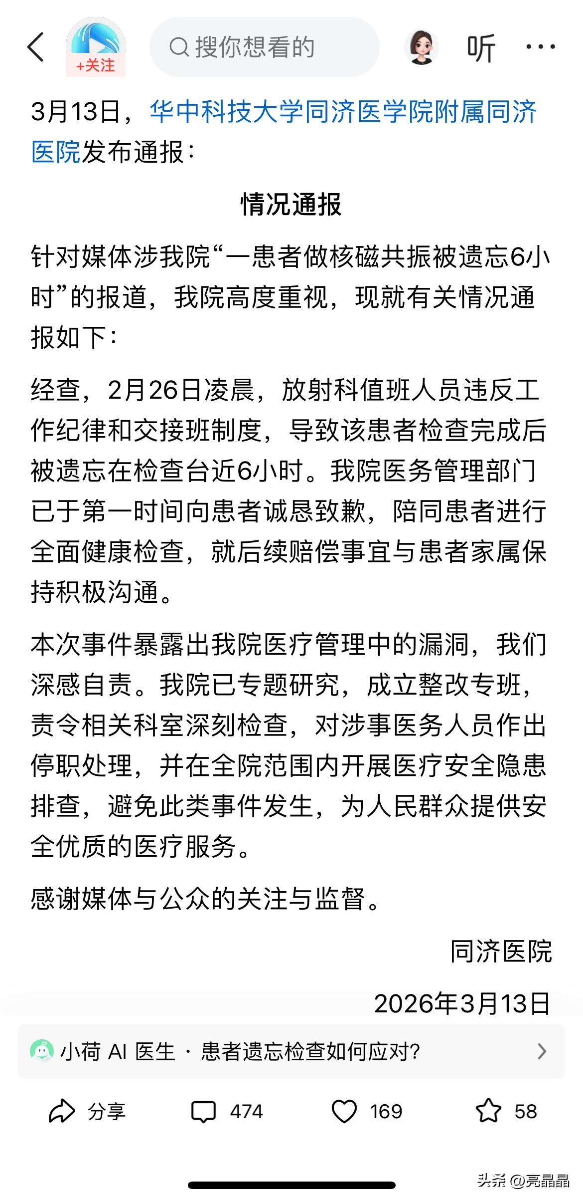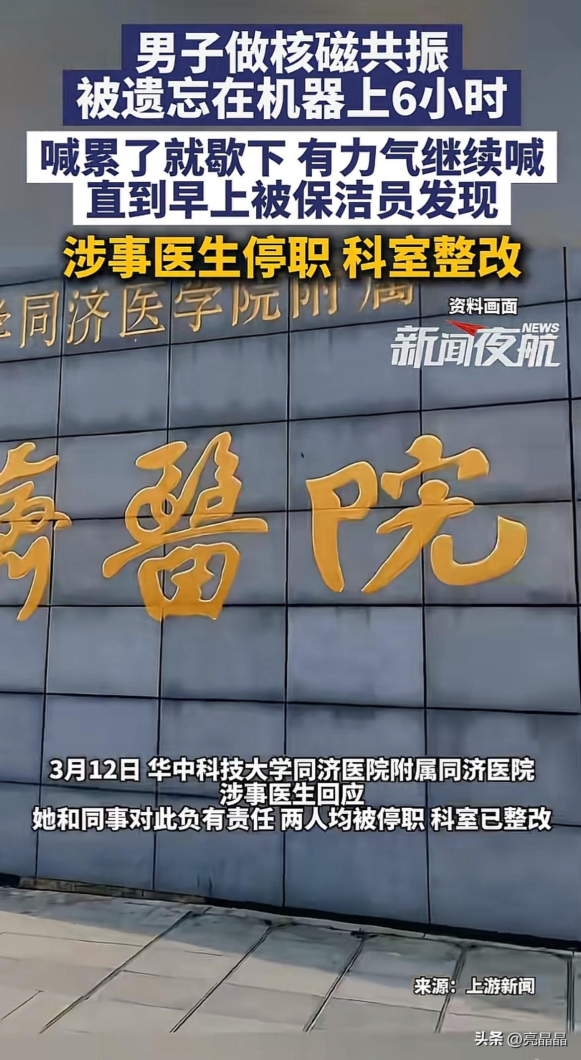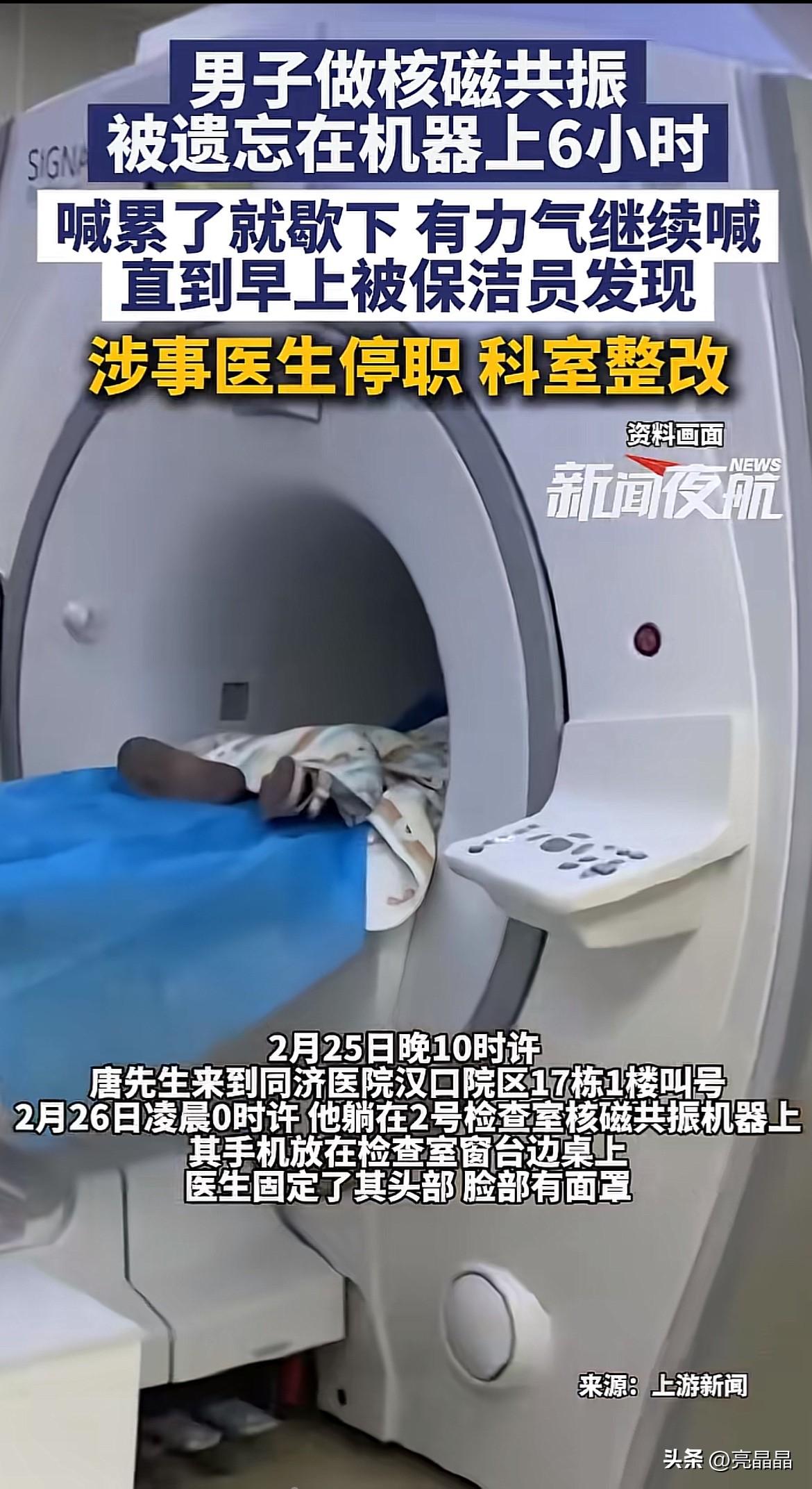 “有人吗?救命!救命”不敢相信这呼救发生在医院,而这么离谱的真事发生在武汉一医院,病人被绑在核磁共振机器一夜,直到早上保洁做卫生才发现。 2月25日晚10点唐先生因颈部疼痛到医院挂号,26日凌晨被安排做核磁共振,躺在床上,头部被固定,被戴上面罩,本想一会就好了,没想到这一躺就躺了一夜。 半个小时后,唐先生对医生说:“怎么这么久还没做完?”可空荡的检查室没有回应。 唐先生意识不对劲,继续呼救:“有没有医生在?”“有没有人”“还有人在机器上”“救命!救命!” 唐先生各种呼救,都没人应答,就这样被绑在核磁床上,耳朵还传来核磁机器的响声,以为机器还在工作,想挣脱起身,却怕误触机器引发危险。 躺在足足6小时,一遍又一遍地呼救,内心无比恐惧和不安,直到早上六点,保洁阿姨出现,联系了保安求助,最终才得救。 原来当时给唐先生检查的医生做完了检查,系统上标记已完成,然后因为被部门人员叫走去忙其他事,就传达让接班同事把唐先生放出来。 可接班同事不知是没听到转达,还是忙忘了,没检查机器就离开了,这才导致把病人遗忘在核磁机器上。 更荒唐的是,唐先生老婆当晚见老公久久未归,电话不接,报了警,民警带着去医院询问,被告知唐先生凌晨0点10分已经做完检查,也没去查看一下核磁机器上是否有人。 目前医院对失职的两名医生停职,给唐先生赔礼道歉,双方就赔偿金额未谈妥,医院建议他起诉。 有人说这是核磁检查,没有辐射,对身体没有影响。 还有人说核磁只固定头部,病人可以自己挣脱起身的,为什么硬躺6小时? 也有人说这算是重大医疗事件,医生只是停职,这惩罚也太轻了,应该开除处理。 为什么大家对医院犯这种低级错误这么严格? 原因很简单,这事发生在医院,人命关天的地方,不容一点疏忽和错误,虽说这次核磁检查被遗忘没造成严重后果,但难保下次不会出现在危急手术中。 说白了,这次疏忽恰恰暴露了医院科室科室流程操作不严,医护责任心缺失,这种错误不该发生在知名三甲医院,这损坏的是医院的声誉和公信力。 这就像一根刺,扎进病患和家属的心里,对医院的专业和负责产生质疑,怎么敢轻易将性命交付在这样的医院呢? 虽说唐先生这次身体没受得实际伤害,但被困封闭空间6小时,叫天不不应、叫地地不灵的那种恐惧和绝望,对心理的冲击是巨大的,对本就颈部疼痛的身体而已,长时间不能动弹更是雪上加霜。 我觉得院方应该拿出更大的诚意解决这事,而不是赔偿谈不拢,就让病患起诉,这不仅寒了唐先生的心,更是寒了社会公众的心,毁了大家的信任。 对此事你怎么看?欢迎评论区讨论。