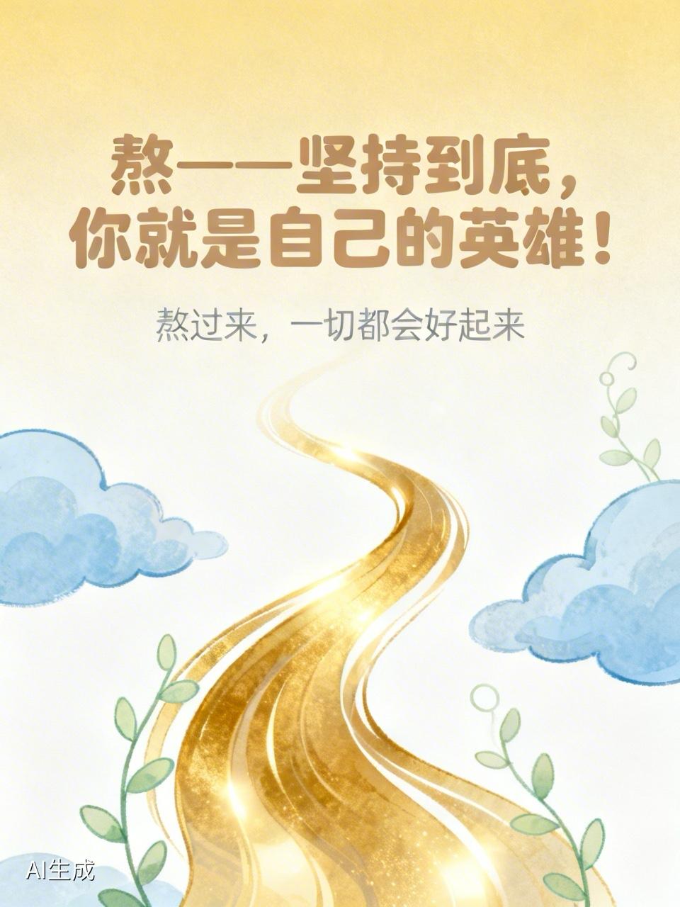 人生最难的时刻,唯一能做的就是“熬”——坚持到底,你就是自己的英雄! 人生,有时候真的很难。 当你陷入低谷,四周黑暗无边,仿佛整个世界都在和你作对,那一刻,你会觉得孤立无援,甚至想要放弃。可其实,人生最难的时刻,唯一的路,就是“熬”——熬过来,一切都会好起来。 每个人的生命中,都有那么一段艰难的日子。那些日子里,你可能会觉得自己像一只孤舟,漂泊在狂风暴雨的海上,找不到岸边;你可能会觉得四面楚歌,没有一个人能真正理解你的痛苦;你甚至会怀疑,自己是否还有继续前行的勇气和理由。 但正是这些“熬”的时刻,塑造了我们真正的坚韧和勇气。 人生的道路,从来不是一条平坦的大道。你以为翻过一座山就是胜利,结果迎来的却是下一座更高的山峰。每一次的坎坷,都像是在考验你到底有多强大。而每一次的坚持,都是在告诉自己:我可以,我行,我一定能挺过去! “熬”不是简单的忍耐,更不是消极的等待,而是一种积极的选择,是用坚定的信念和不屈的意志,在痛苦中舞蹈,在荆棘中开花。 很多人说,“熬”字看似简单,说起来容易做起来难。 确实,熬需要你扛住压力,耐住寂寞,还要有不动摇的心。 当你身处人生的至暗时刻,伸手不见五指,没有人能帮你,你只能独自面对黑暗和恐惧,这种孤独感是任何言语都难以描述的。 但也正是这份孤独,让你学会了自我救赎,学会了在绝望中寻找希望。 那些选择放弃、不愿意熬下去的人,或许早已在生活的风暴中败下阵来。 而选择坚持的人,虽然步履维艰,却一步步走向光明。 人生就是这样,一步一个脚印,靠的就是这份毅力和决心。 熬,不是软弱的退缩,而是用尽全力去坚持一件值得坚持的事,去守护那个最真实的自己。 最难的时候,别指望别人来拯救你。 你会发现,能帮你的人不一定愿意帮,想帮你的人也未必有能力帮。 诉说苦楚,换来的往往是同情的目光、无奈的叹息,甚至冷漠的漠视。 所以,真正能救你的人,只有你自己。 相信自己的力量,给自己勇气,独自前行,才是最可靠的路。 每一个独自走过的坎坷,都是你熬出来的坚强。 这个世界上,绝大多数人都在默默“熬”着。 有时候,不是你有多能熬,而是你别无选择。 不熬,可能就没有出路了;熬下去,至少还有希望。 也许,熬不一定马上能见到光明,但熬,是唯一的选择。 只要你还在坚持,人生就还有转机。 放弃,只会让绝望吞噬你。 所以,熬吧! 用无声的坚持,给自己加油鼓劲,告诉自己:我能行,我一定能熬出头! 人生的重量,没人能替你扛。 但只要你愿意熬着熬着,苦难会变得不那么沉重,黑暗会慢慢散去,前方的路也会渐渐明朗。 “熬”字里藏着希望,藏着力量,藏着未来。 只要你坚持,终有一天,你会守得云开见月明,迎来属于自己的光辉时刻。 所以,亲爱的你,别怕熬,别怕苦。 熬过去,你就是自己的英雄。 因为,人生最难的路,就是坚持走下去的路。 愿每一个熬着的你,都能迎来属于自己的春天!低谷期要坚强 励志人生低谷期