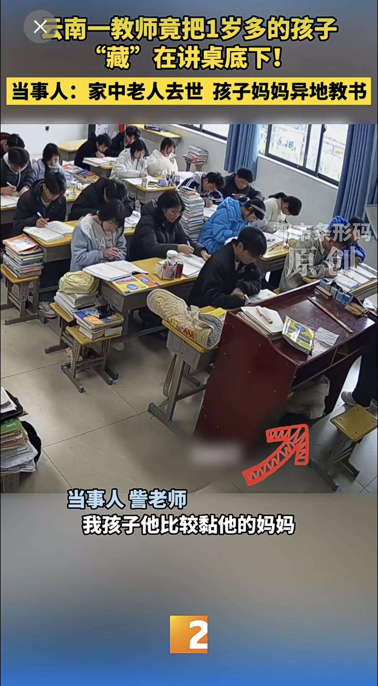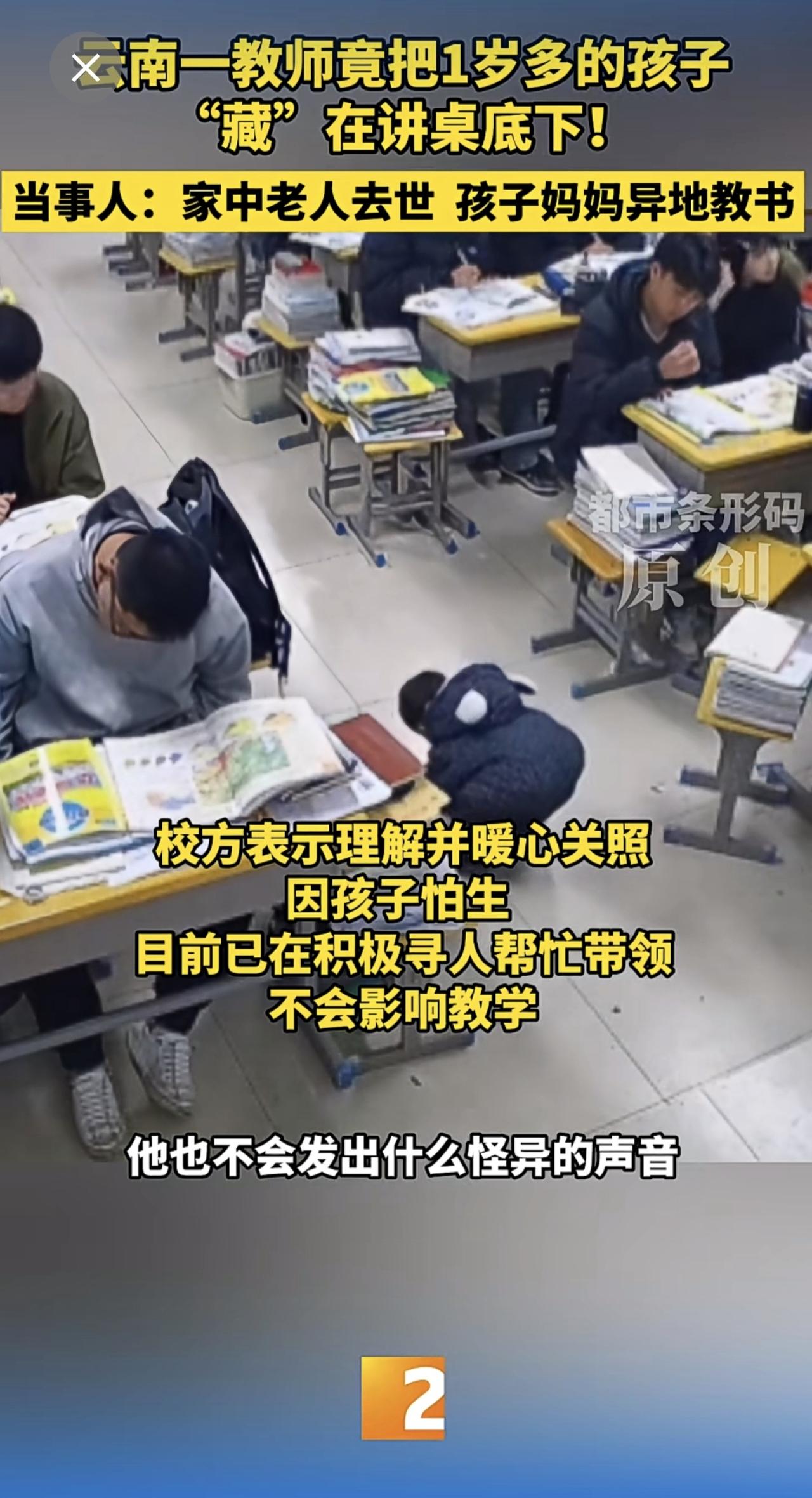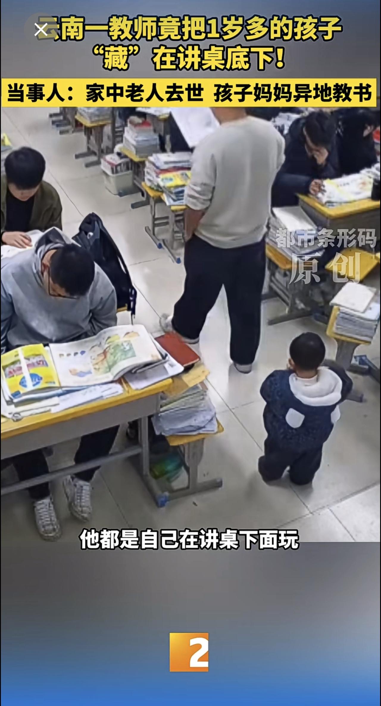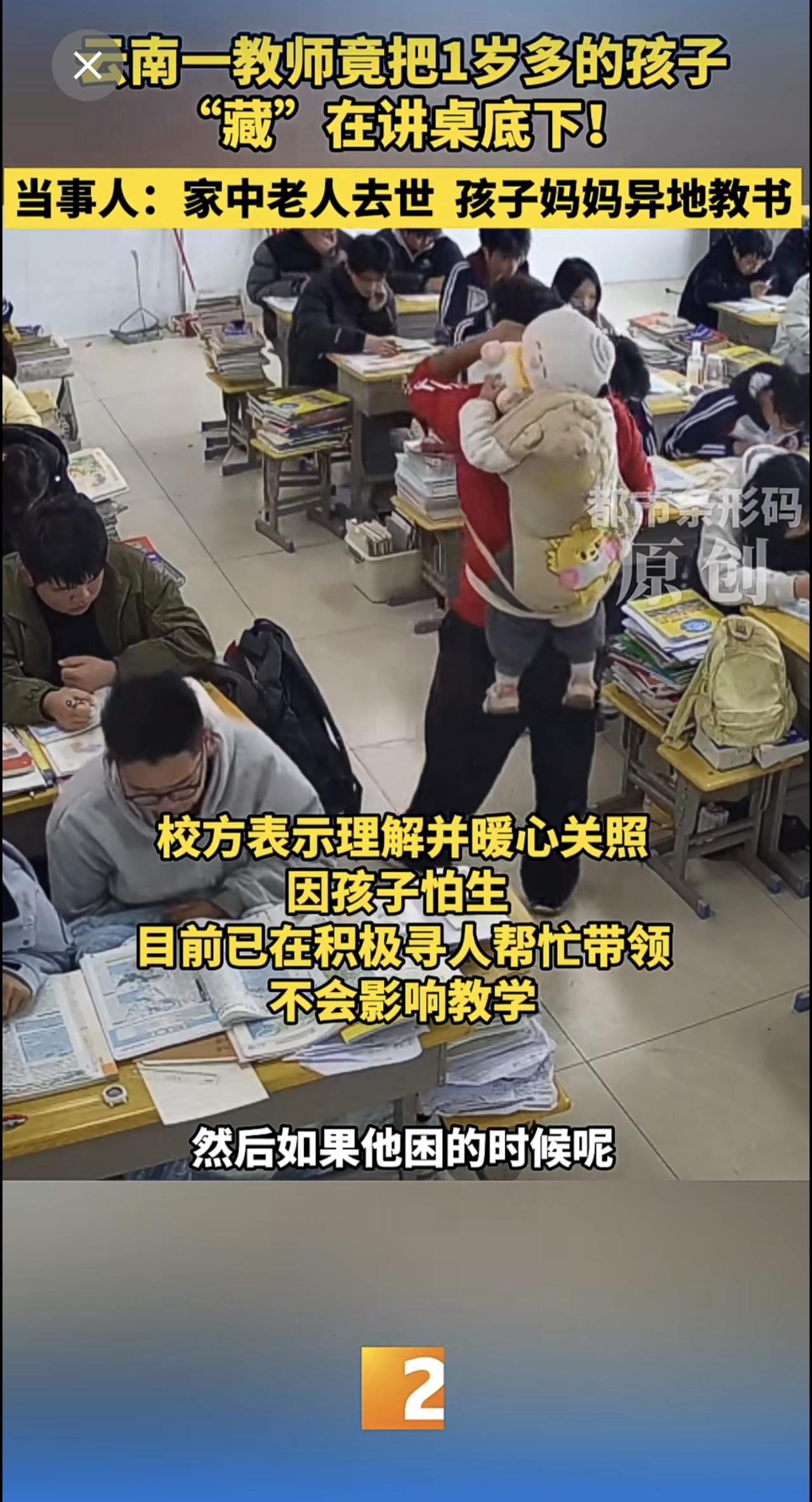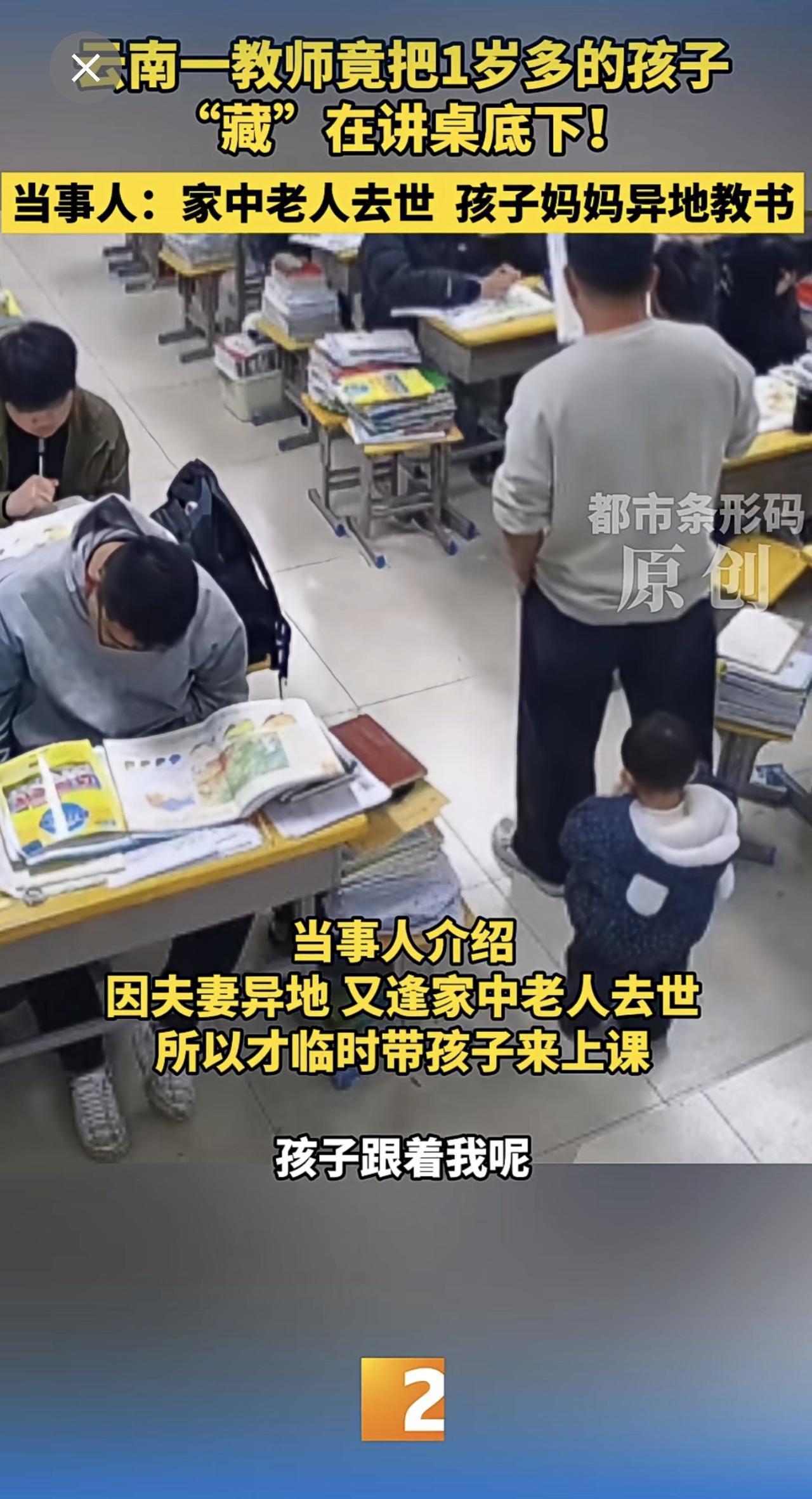 云南一教师竟把1岁多的孩子“藏”在讲桌底下!当事人:家中老人去世 孩子妈妈异地教书 云南教师 带娃上课