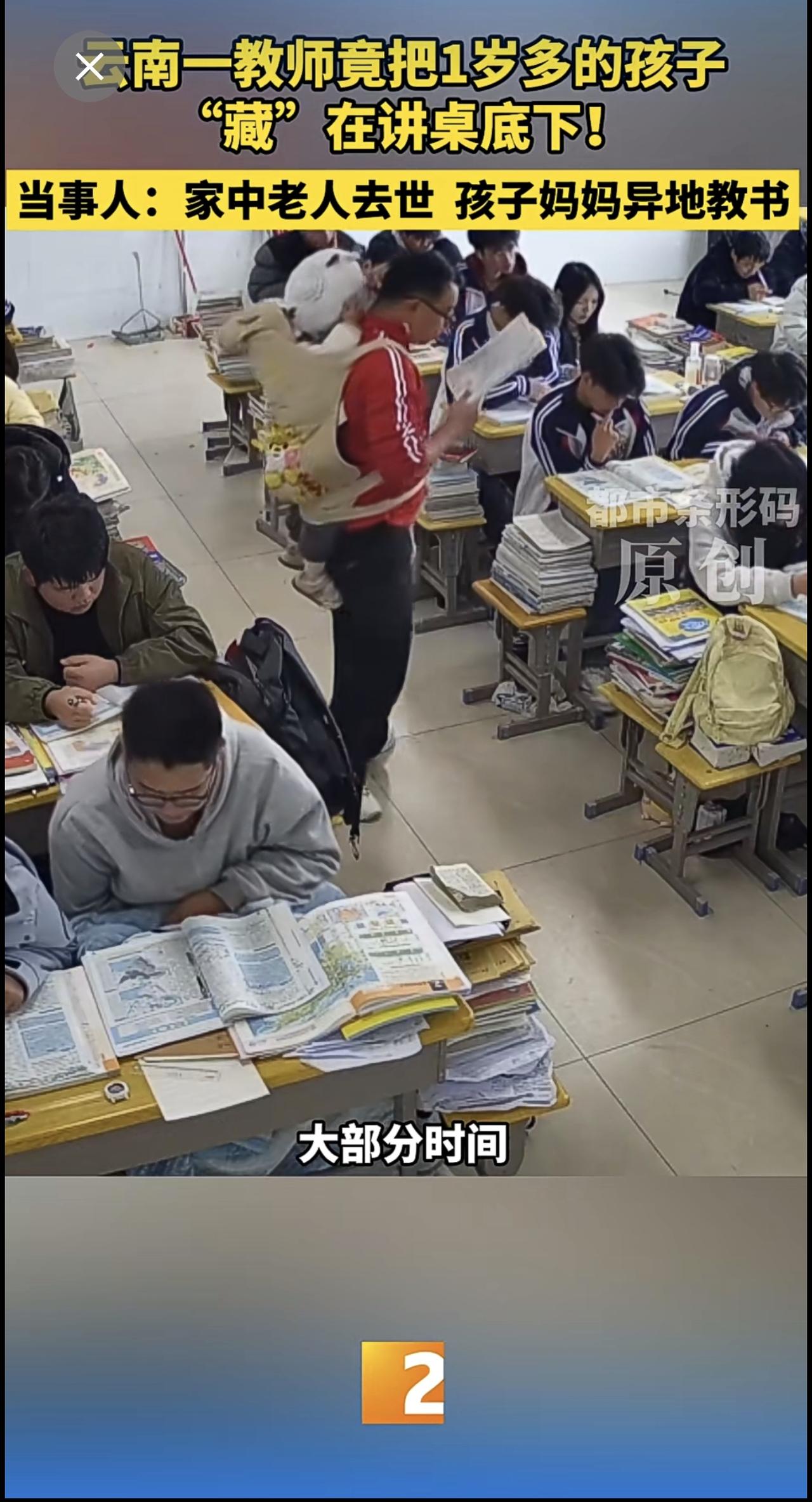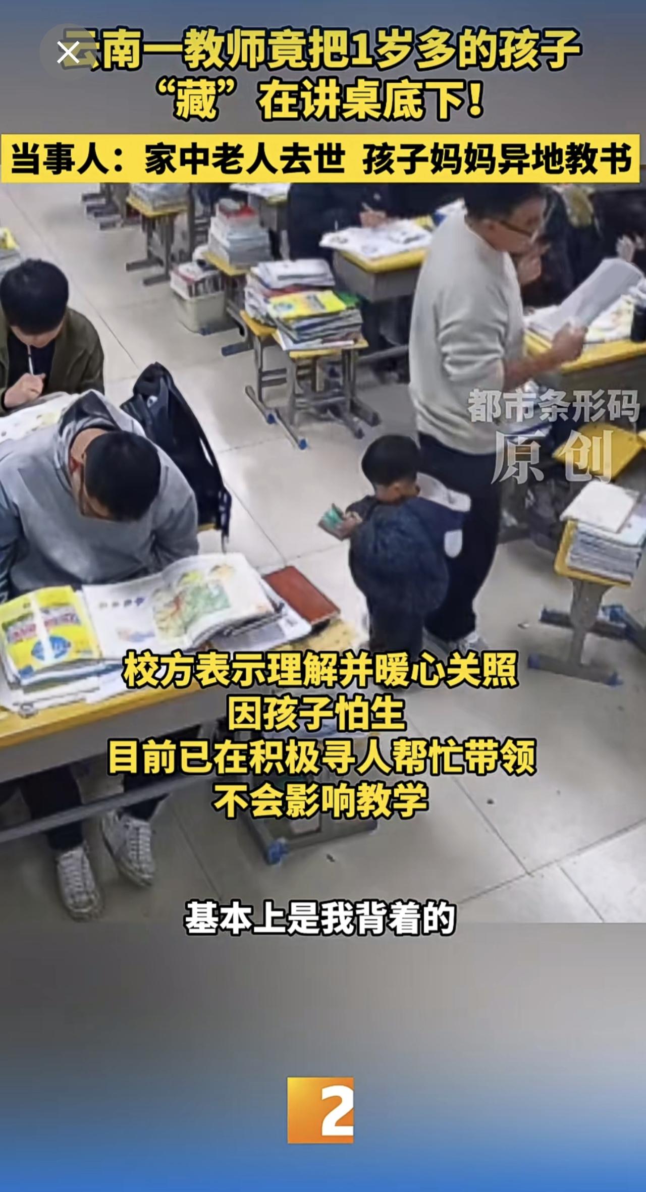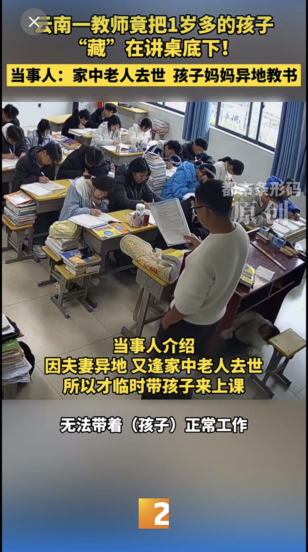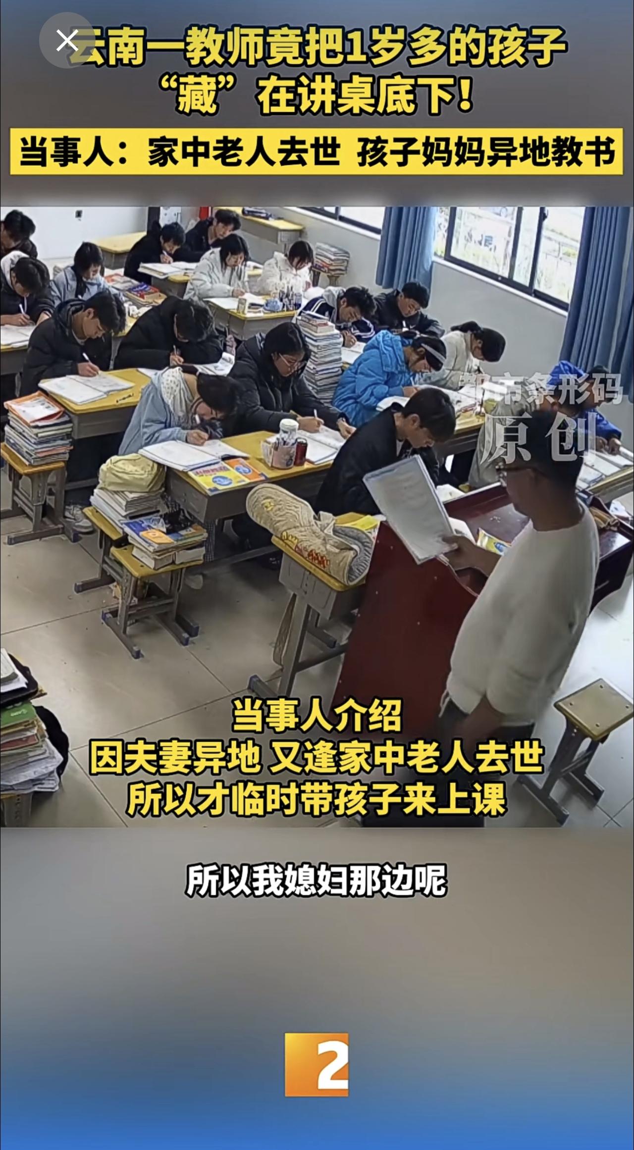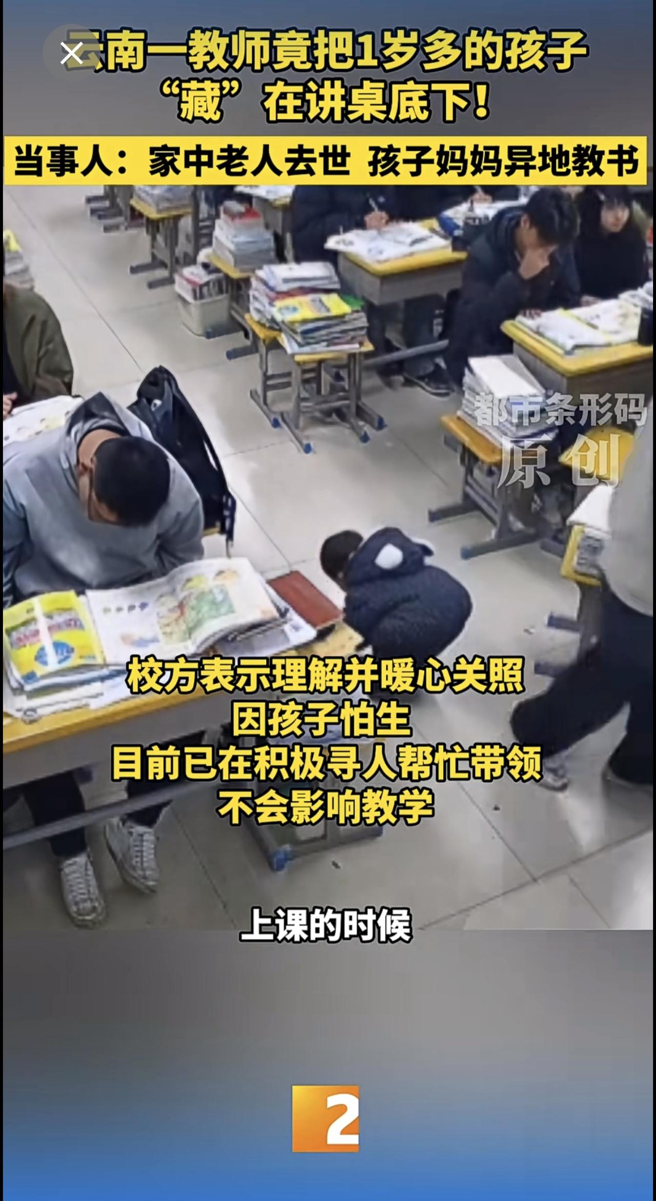 云南一教师竟把1岁多的孩子“藏”在讲桌底下!当事人:家中老人去世 孩子妈妈异地教书 云南教师 带娃上课