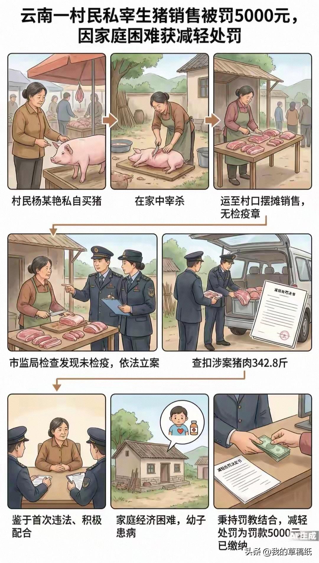 情与法的天平:村民自宰生猪被罚,民生刚需与食品安全如何两全? 云南砚山一村民因在家屠宰生猪并摆摊销售,被市场监管部门没收猪肉并罚款5000元。当地表示,依据食品安全相关规定,除自宰自食外,生猪销售均需定点屠宰并检疫,该处罚已从法定标准大幅减轻,综合考虑了当事人家庭情况与违法情节。 此事引发广泛关注,不少网友对农户表示同情。该村民属首次违法,猪肉尚未售出,无违法所得,也未造成食品安全危害。其家庭本就困难,希望通过卖肉增加收入,处罚与没收猪肉让其生活压力更大。 当前,公众普遍关注食品安全监管与小微民生权益如何平衡。有人建议,对无危害、无获利的首次轻微违法,可采取首违不罚、批评教育为主;查获的猪肉可先经专业检验,合格则允许合规销售,不合格再依法处理。 监管的初衷是守护食品安全,而执法温度同样重要。如何在严守规定的同时,更好解决群众实际困难,成为此次事件留给基层治理的思考。 春日生活打卡季