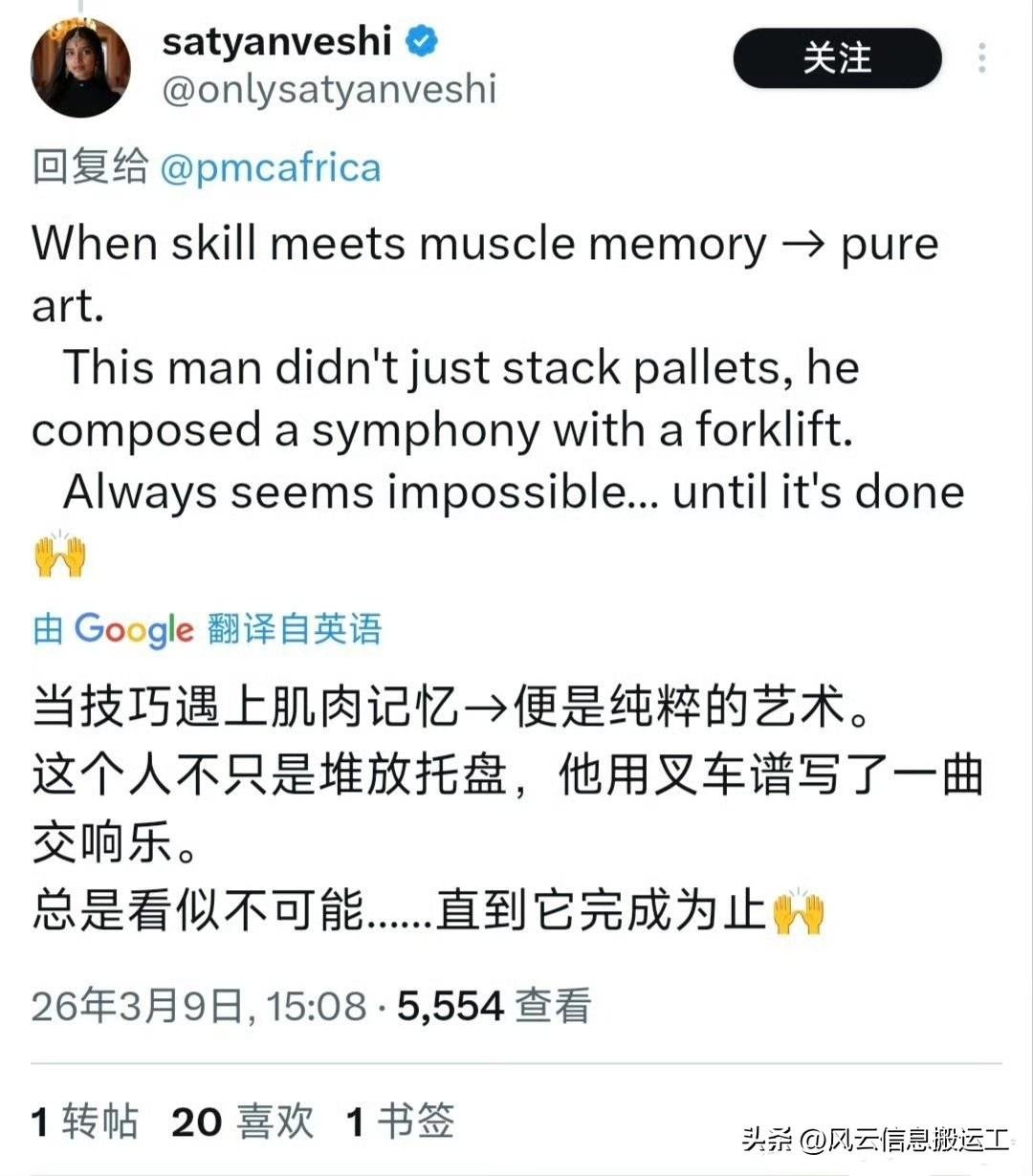外网上一段中国人操作叉车的操作视频,引得众多国外网友围观称赞 !