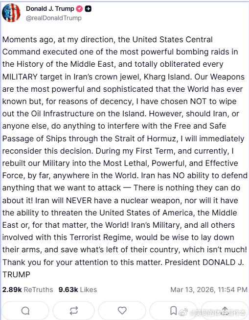 就在刚才,在我的指示下,美国中央司令部对伊朗的“皇冠上的明珠”哈尔克岛发动了中东历史上威力最强大的轰炸之一,彻底摧毁了岛上所有军事目标。