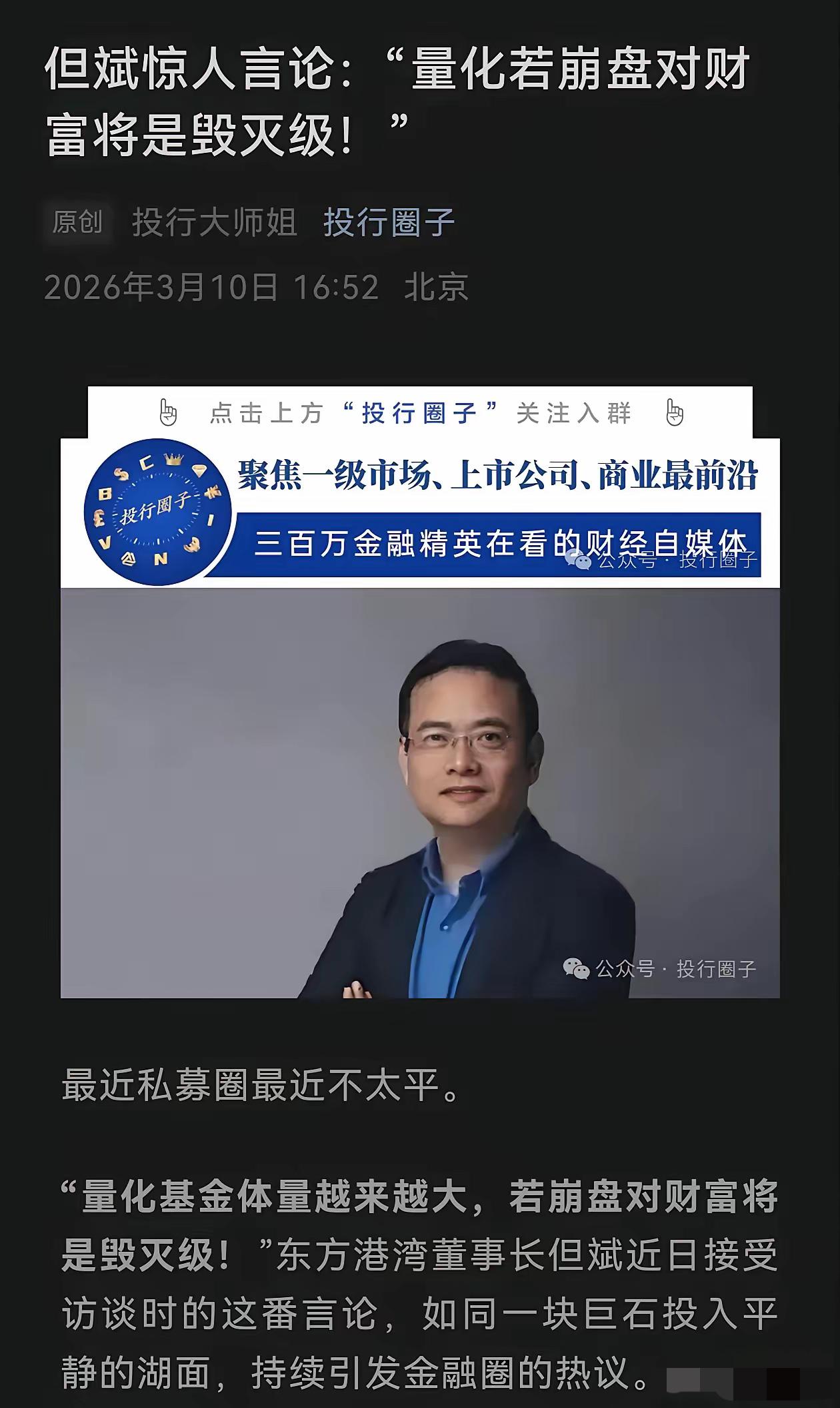 但斌说量化基金体量越来越大,若崩盘对财富将是毁灭级。量化能不能最终带崩股市不确定,但是量化助涨助跌的尿性肯定做不出什么好事? 现在市场动不动就跳水,跟量化有很大关系。市场非常不稳定,最可怕的是,指数又被指导在窄幅区间,然后运行着全世界最高频的疯批量化,这等于把量化的血腥放到最大。 量化交易不是投资,量化交易是对投资者的收割工具,它的存在使投资者望而却步,它是阻止投资者对市场进行投资,对国家经济不是起到促进作用,而是国家经济发展的跘脚石。 量化交易的存在关键在于制定的规则是否合理,是否符合提倡的长线投资,有一点可以肯定的是它是交易税的重要提供者,所以不会取消还要推广。