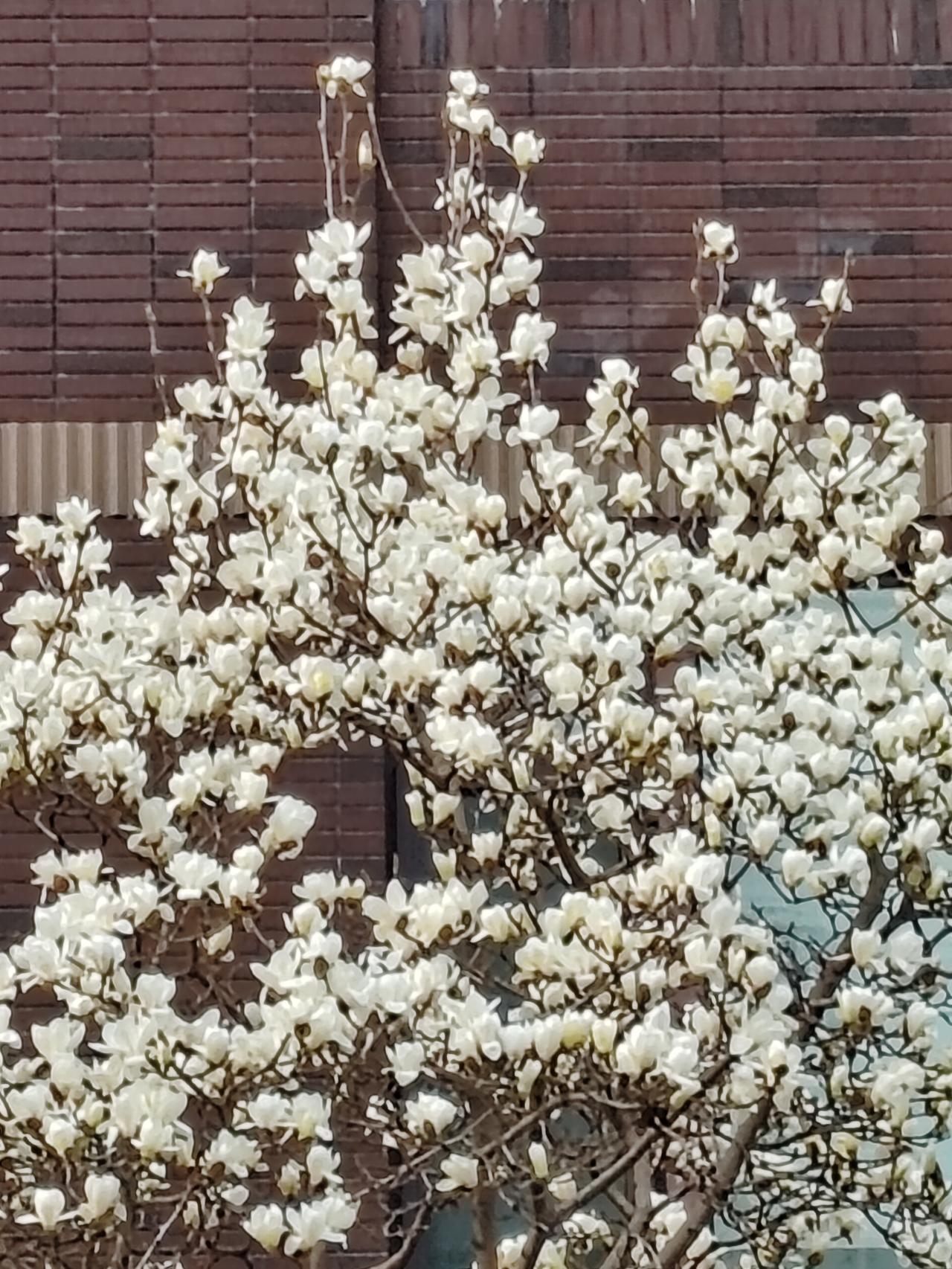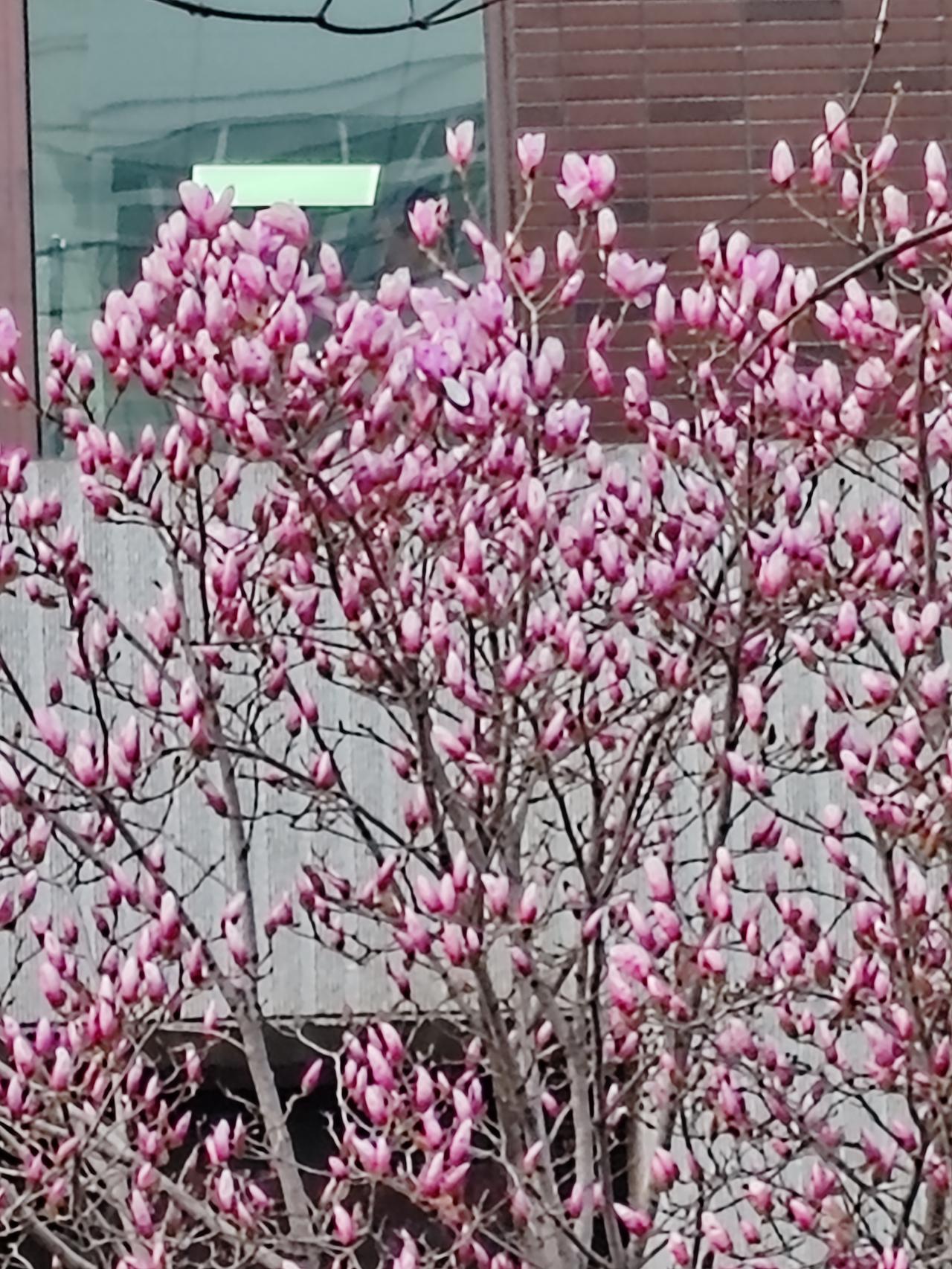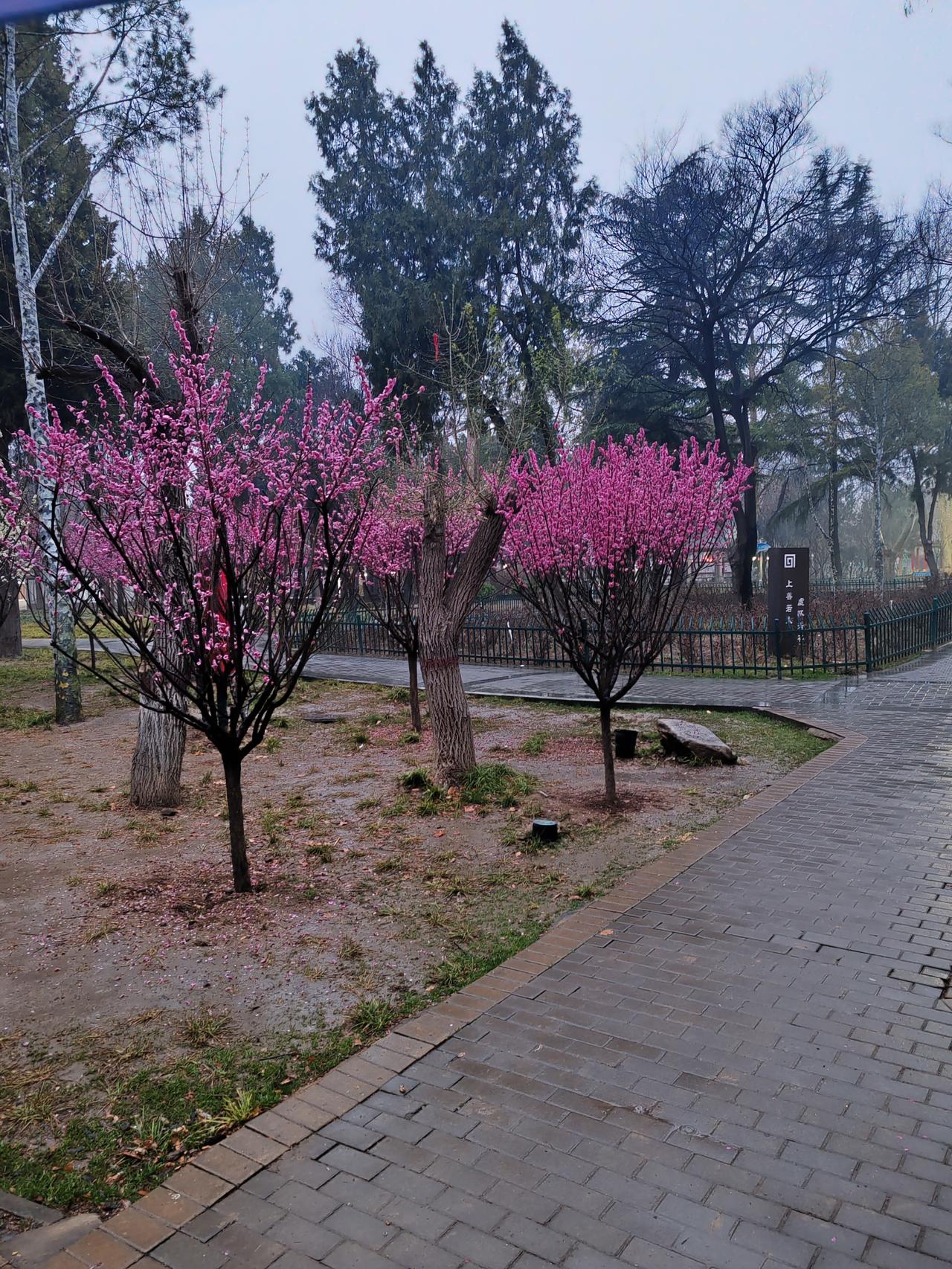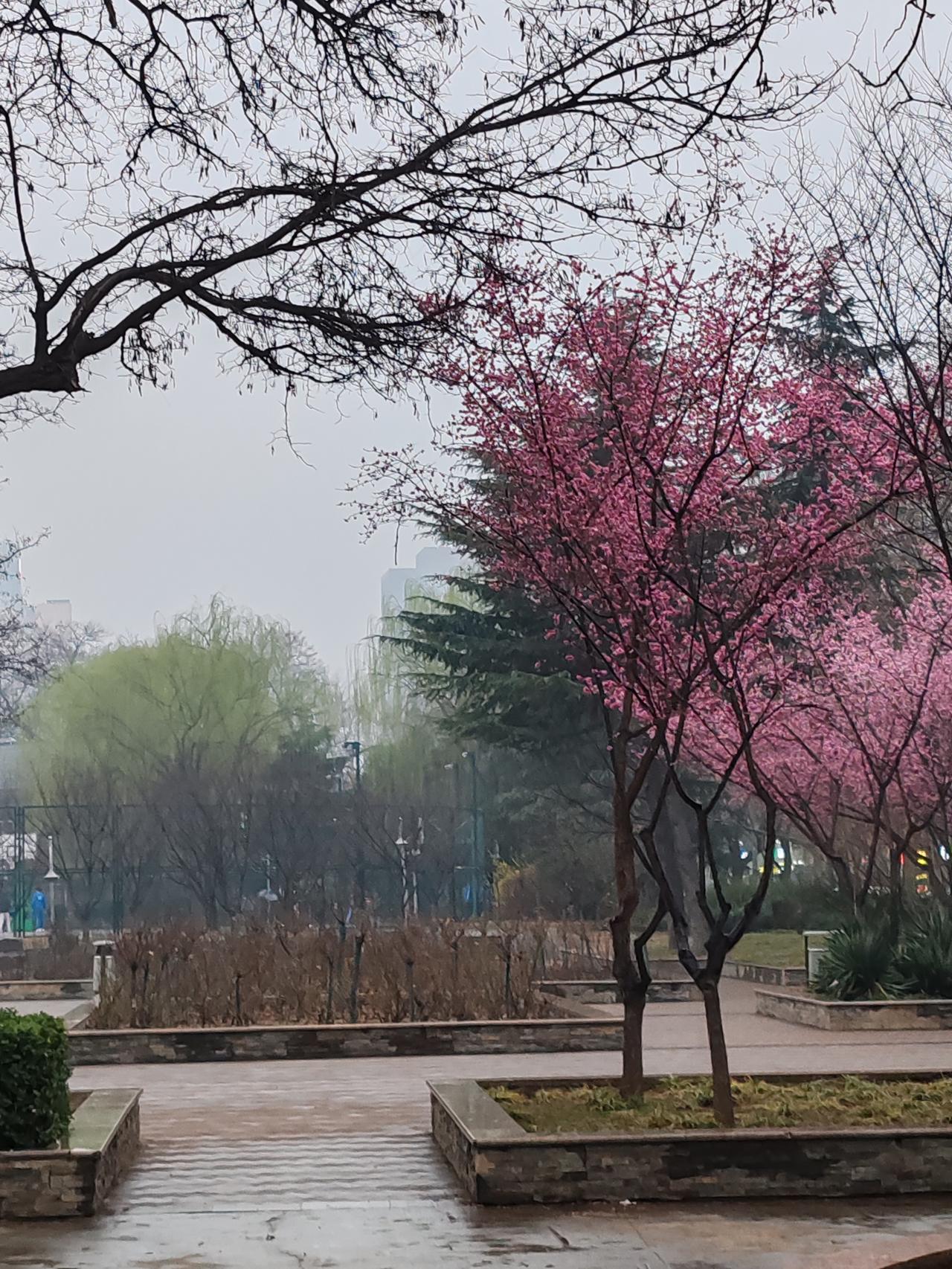 雨落花径湿,松遮树下干。连翘黄黄立,玉兰花向天。草遇水更绿,梅润香难传。远山含淡