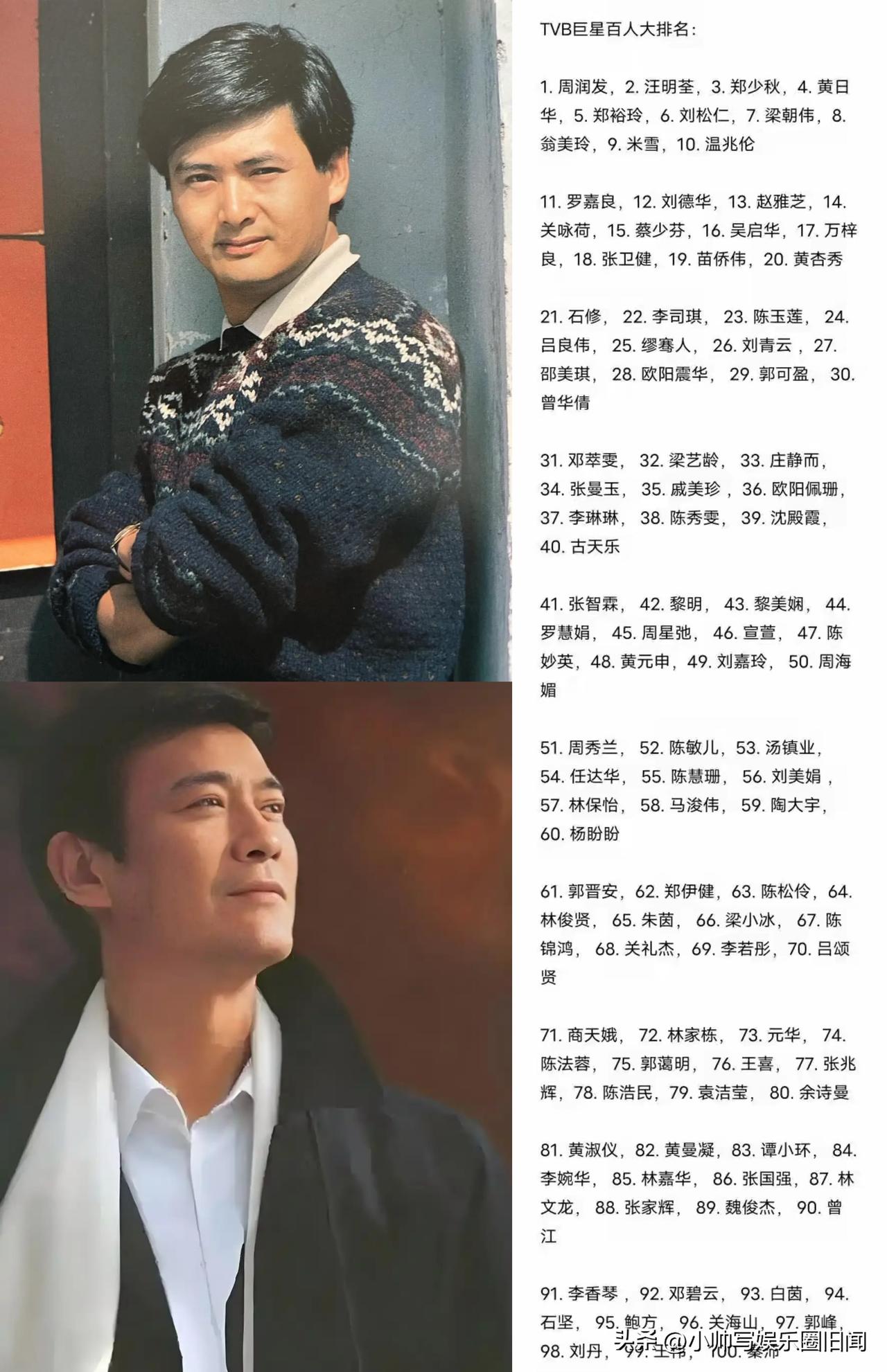 TVB史上成就最高的艺人是谁?不同年代的观众有不同的拥趸,不同剧种爱好者有不同的想法,这都很正常。 本着官方认证大于观众偏好的原则,我们一起来看看TVB曾评选出的“百位巨星排名”的前十名都有谁: 1,周润发 2,汪明荃 3,郑少秋 4,黄日华 5,郑裕玲 6,刘松仁 7,梁朝伟 8,翁美玲 9,米雪 10,温兆伦 …… 大家觉得谁的排名偏高,谁的排名靠后了?欢迎评论区留言讨论。 TVB