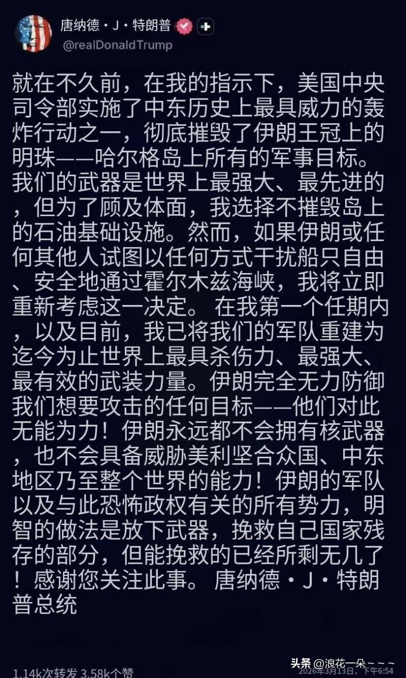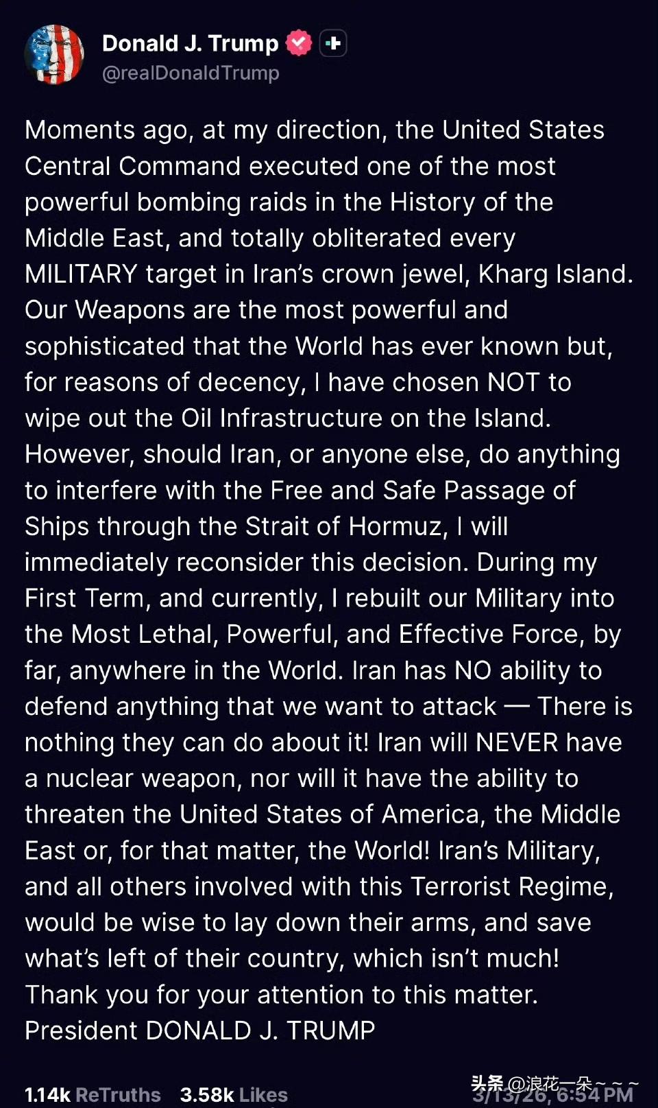 特朗普,急了? 他有点焦虑的说:就在不久前,在我的指示下,美国中央司令部实施了历史上最强有力的轰炸行动之一,彻底摧毁了伊朗“皇冠上的明珠”——哈格岛上的全部军事目标…(图二) 由于文字比较长,我就翻译了,不说了,大家自己看看吧,反正总之一点,特朗普继续对伊朗进行口头威胁,让伊朗放下武器。继续把伊朗作为软弱的“敌人”,把美国作为强大的军事国家。 也可以看出,他现在几乎所有的注意力都集中在了霍尔木兹海峡,我在想是不是霍尔木兹海峡就是美国的软肋被伊朗给抓住了。