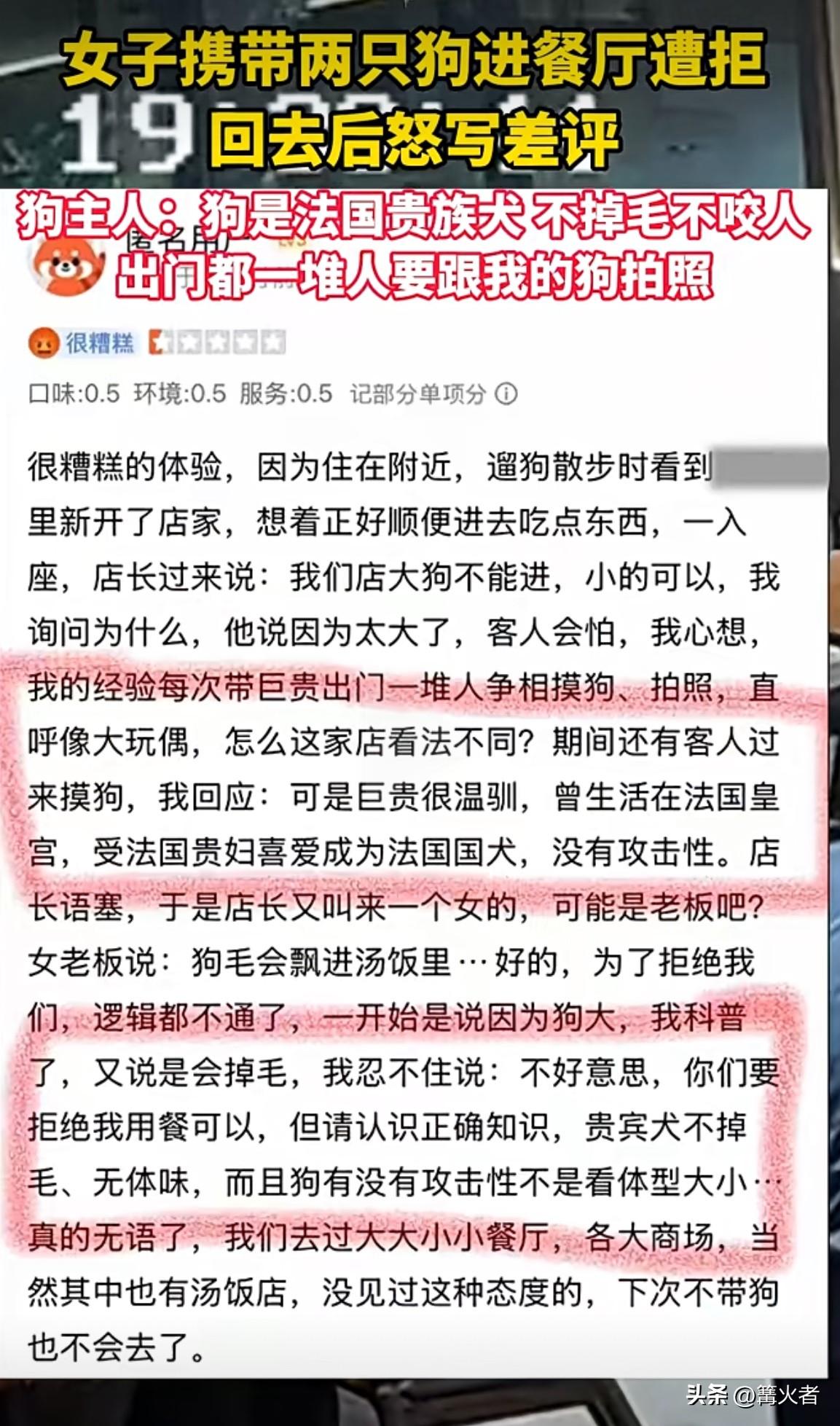 她还振振有词,说狗是法国贵族犬,不掉毛不咬人,出门一堆人要跟狗拍照,且不说餐厅有餐厅的规定,就算狗再“高贵”,也不能不顾他人感受强行带进去。很多人对狗有恐惧或者过敏反应,在餐厅这种公共场合,更要考虑大众的接受度。网友一边倒地支持店家,说明大家都明白公共秩序和他人权益的重要性,被店员礼貌拒绝后,居然当场发飙,回去还怒写差评把店家骂得狗血淋头。