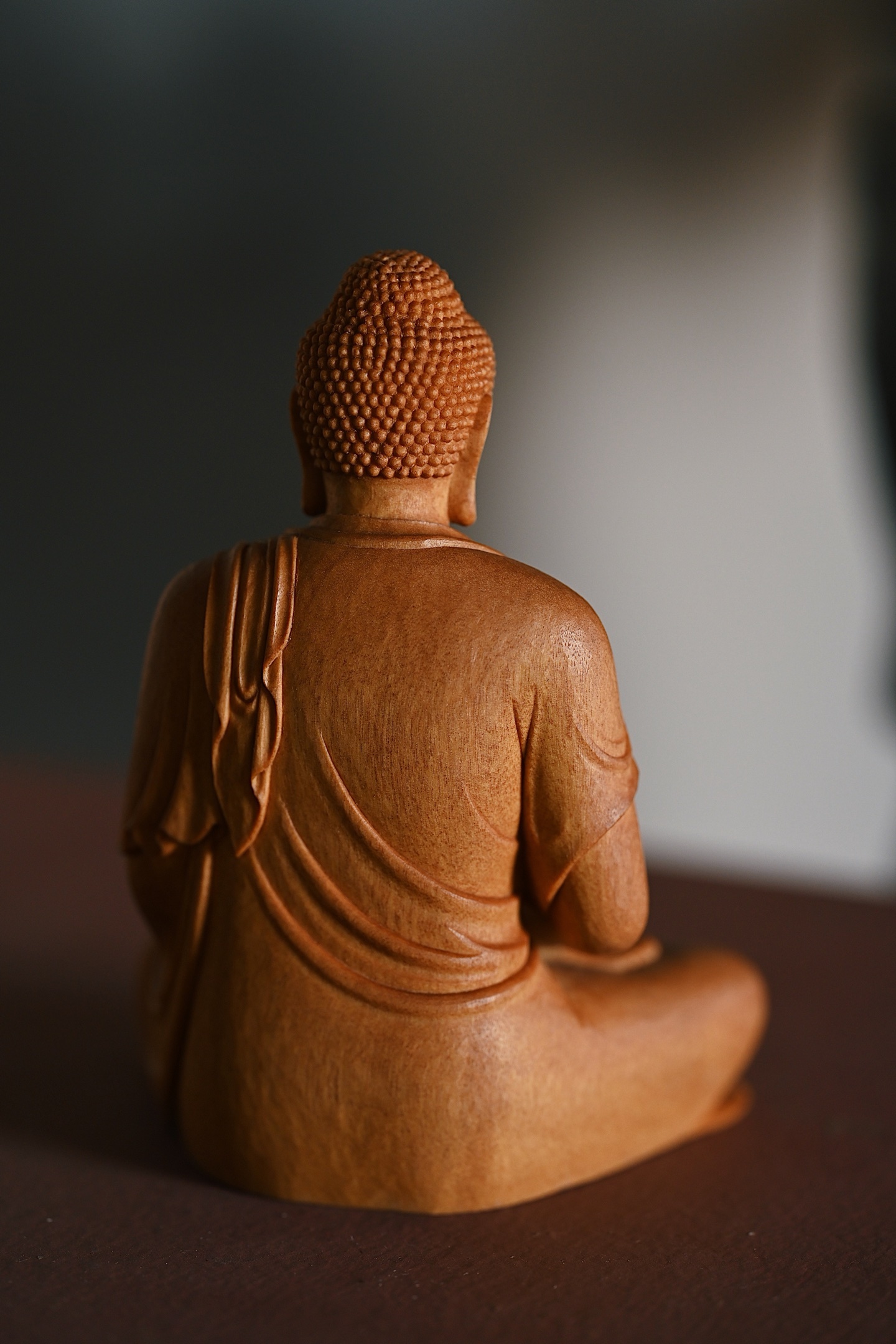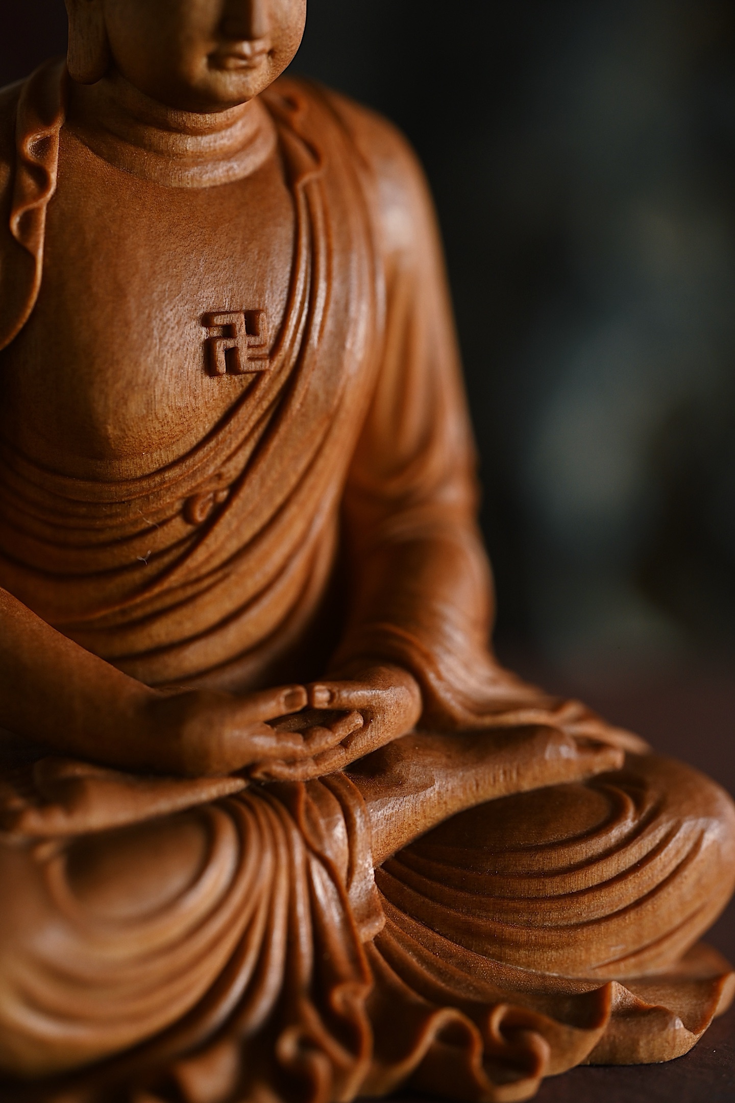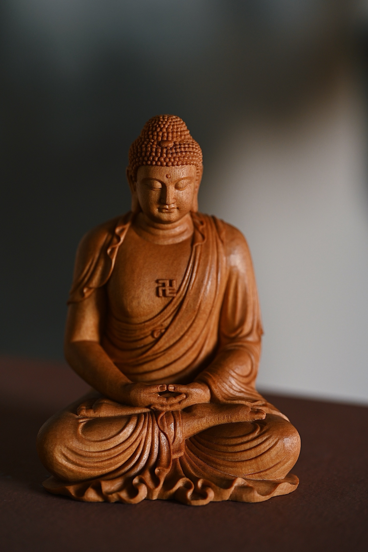 檀香 | 释迦牟尼料质细腻,雕工朴拙,释迦牟尼跏趺而坐,面相端正庄严,双眼略向下