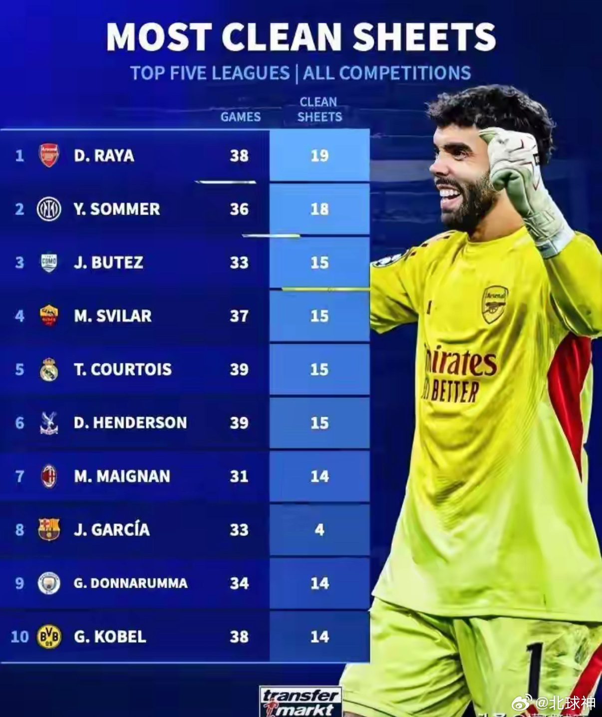 五大联赛最强门将,阿森纳门将拉亚本赛季已经19场零封!