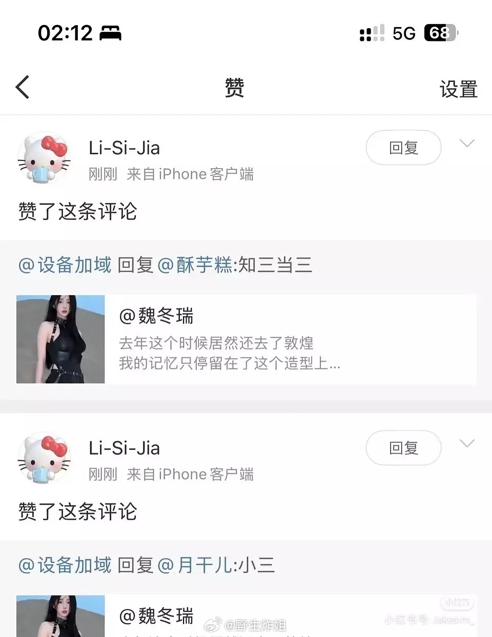 锤:2019年和天雷一起拍摄情侣装的模特。苏苏的闺蜜围脖私信与回复,暗指天雷和苏苏恋爱期间出轨瑞瑞。同时点赞瑞瑞知三当三的围脖。疑似22-23年和天雷旧情复燃,有同款游玩照片。