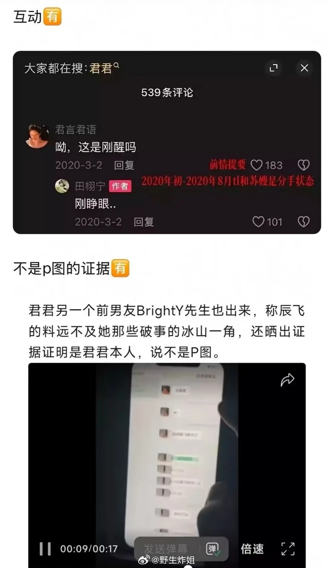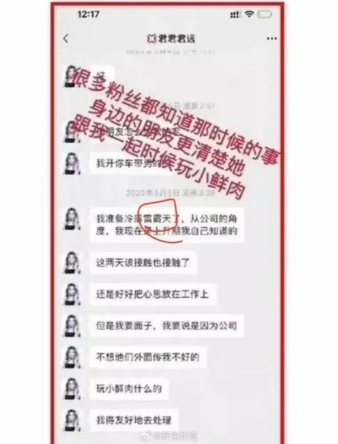 锤:文文在xhs发出和天雷聊天记录,6月份天雷多次喊老婆,疑似因发现天雷孕期出轨,自己被小三,怒而发声。后被于正劝退、收手机。将vx和天雷聊天记录录屏,由天天代为发出。录屏中有天雷语音、天雷和小醋包照片等。