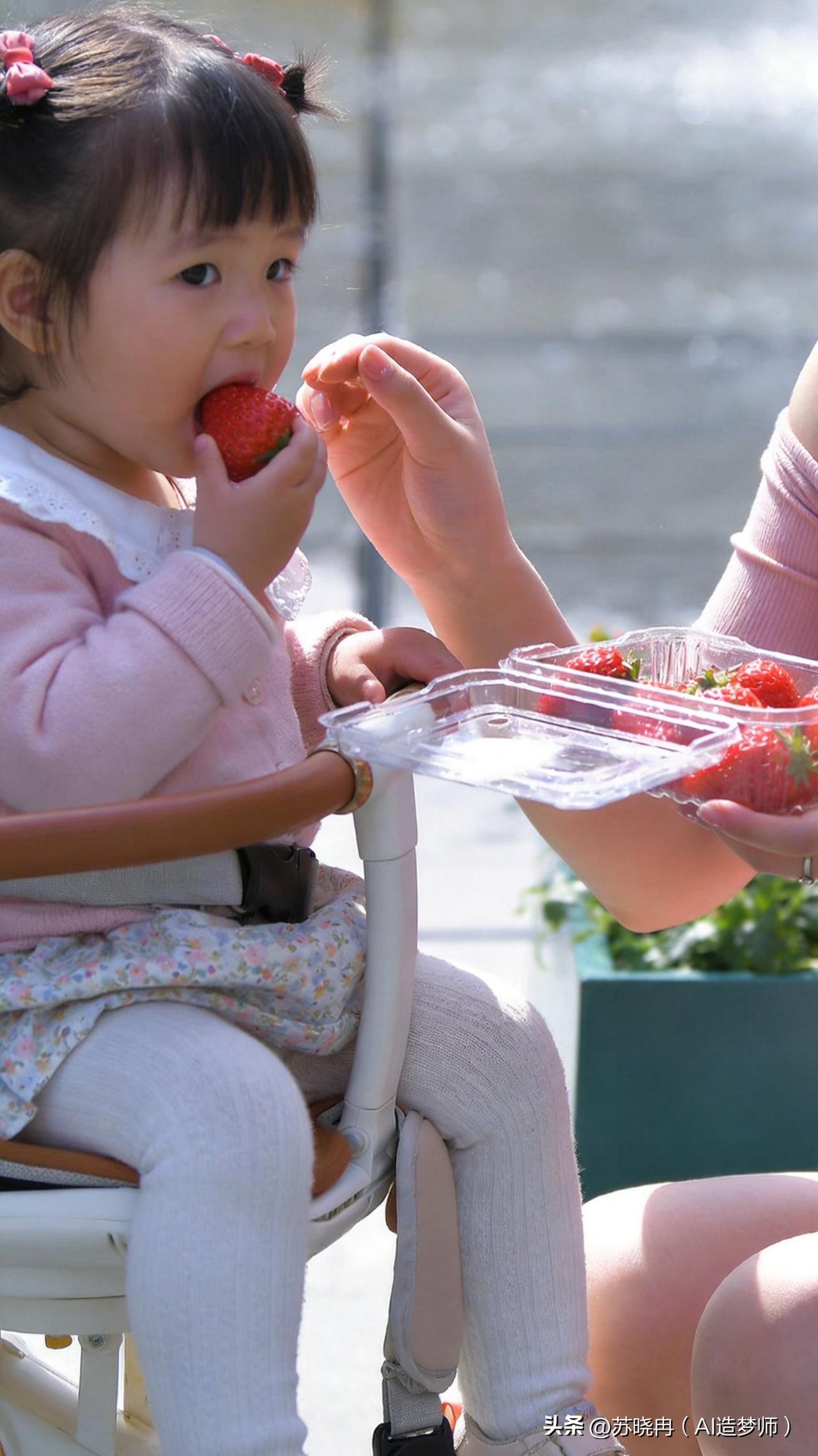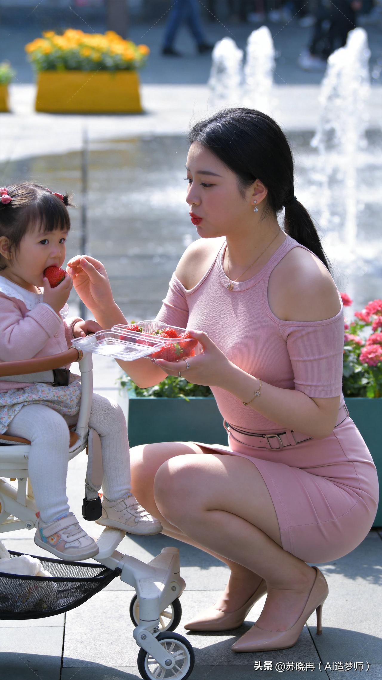 晴光漫洒喷泉旁,粉衣映着暖光,一盒红透的草莓,牵起母女间最软的时光。稚子攥果入口,眉眼弯弯,风里都裹着清甜的暖意。 草莓甜意 晴光碎影落泉旁, 粉袖轻垂伴稚娘。 一颗红莓噙嘴角, 春风也染几分香。 写真人像摄影 苏晓冉
