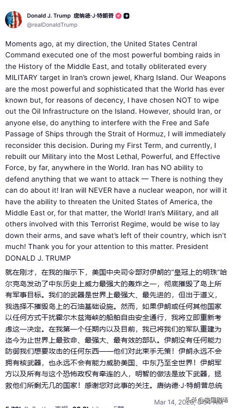 伊朗正考虑,允许有限数量的油轮通过霍尔木兹海峡,但条件是这些油轮运输的石油,必须以人民币进行交易。 特朗普发文称,彻底摧毁了哈格岛上的军事目标,如果霍尔木兹依然被封锁,将袭击岛上石油设施。 来源:realDonaldTrump CNN