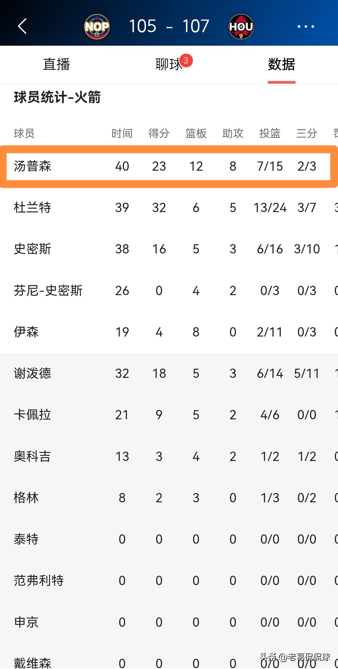 火箭球星阿门-汤普森真是太让人吃惊了!在今天火箭主场以107:105险胜鹈鹕的比赛中,阿门最让人感到吃惊的地方在于,他竟然以非常高的投篮命中率命中了2记三分球。 全场比赛下来,阿门首发出战40分钟,投篮15中7,其中三分球3中2、罚球8中7得到23分,还有12篮板8助攻1抢断,他的场上正负值为全队最高的+11。 老实说,当我看到阿门能够在比赛中命中三分球时,我被震惊的哑口无言,我万万没有想到向来不敢出手三分球的阿门竟然打破了心魔。