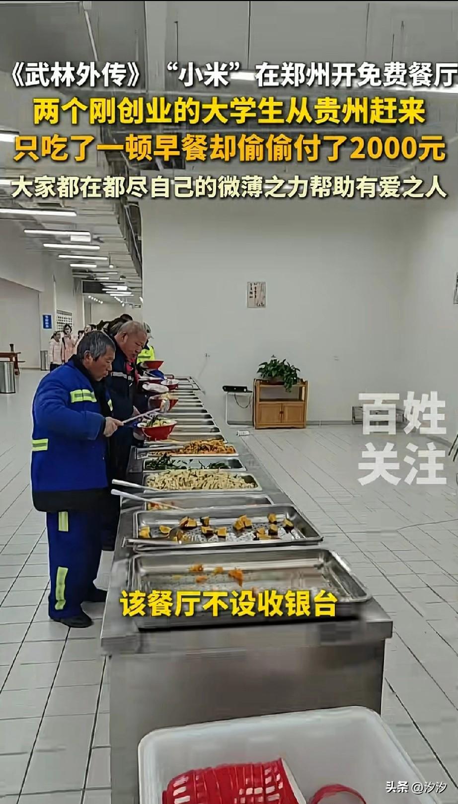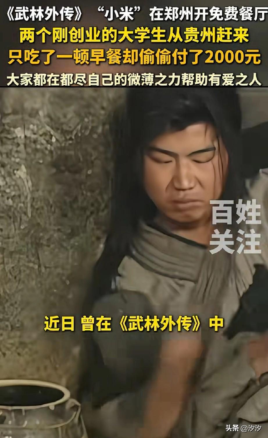 武林外传的演员小米, 居然在郑州开了一家免费速食餐厅, 他的初衷就是想让那些吃不起饭的人有尊严的吃饭, 这个餐厅非常特殊, 他不是任何收银台, 人多的时候单日吃饭超过700人, 部分网友特地从云南,山东各地赶来, 有人吃饭后主动帮助洗碗, 有人吃完饭后默默付了一大笔钱, 大家都希望这个餐厅能够一直开下去, 有两个从贵州来的大学生, 吃完饭后直接付了2000元, 这把老板多感动哦! 老板表示现在大学生创业多难, 这2000元对他们来说就是巨款, 这再一次证明了世间有真爱, 有些人有钱了就想做一些对社会有益的事,而有些人有钱, 就想着豪宅香车美女, 毕竟每一个人的追求不一样, 这种真正做公益的人最值得尊敬, 如果有历史,那将给他记上一笔, 总有人会为这个世界做出自己的一份贡献,大家觉得呢? 郑州 小米盒饭