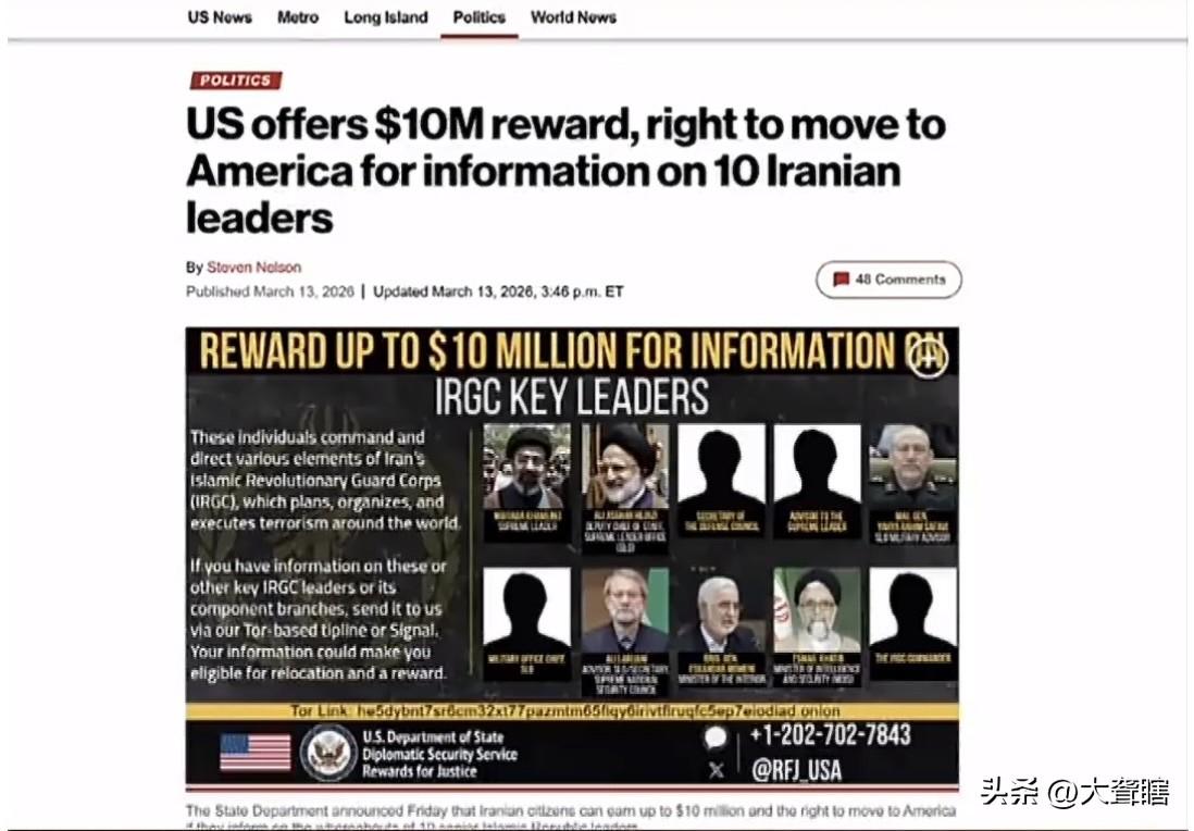 美国最高悬赏1000万美元征集伊朗高官信息! 美国国务院提出一项「正义奖赏计划」,试图通过巨额奖励方式获取伊朗高级官员信息,最高奖赏1000万美元。 根据计划名单,不仅包含伊朗最高新领袖穆杰塔巴,还包括赫贾齐、拉里贾尼、萨法维、莫梅尼、哈提卜等各部门高级官员以及伊朗革命卫队军官。 随着冲突持续升级,双方除军事较量外,在信息战的较量也非常激烈。