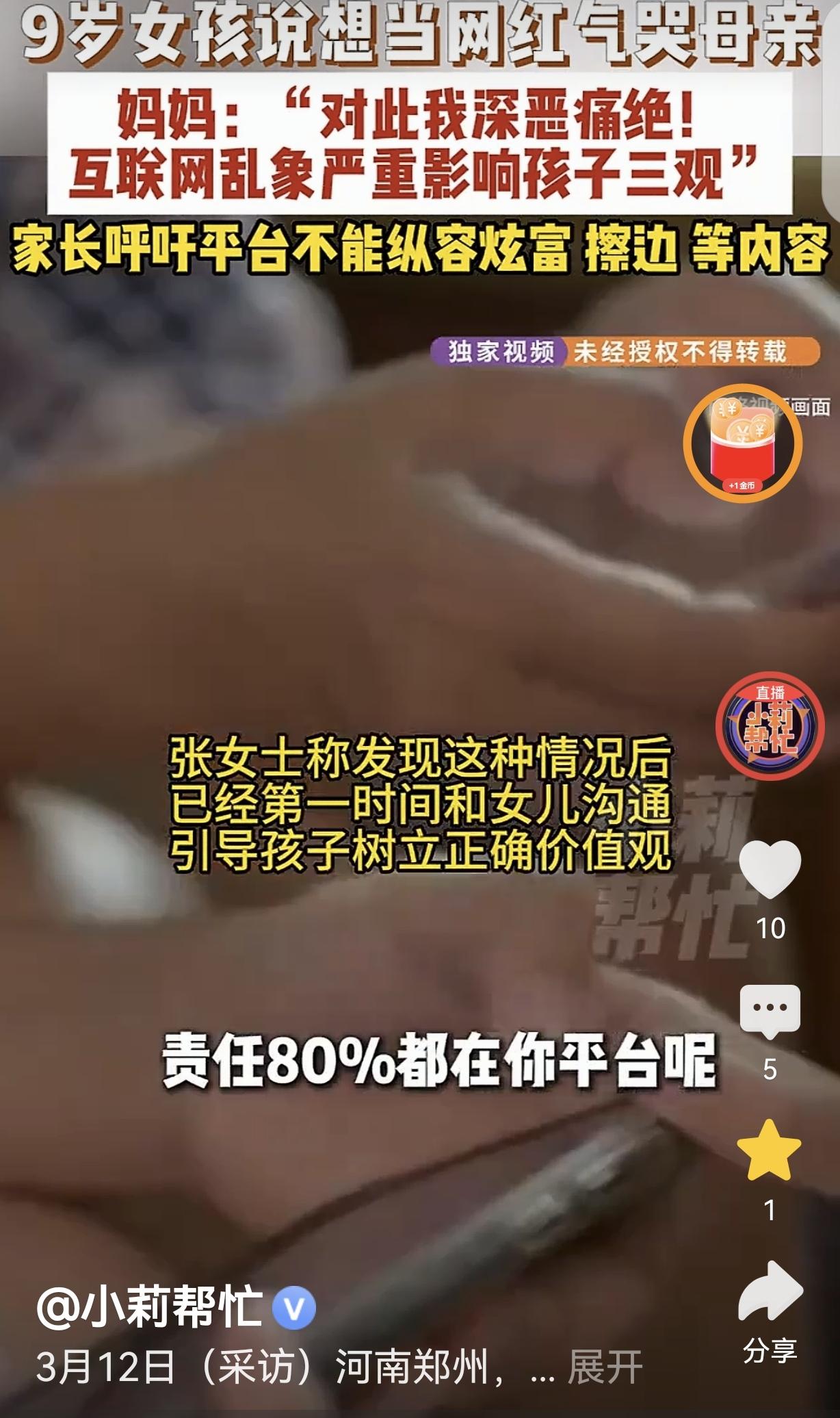 “深恶痛绝!”河南,一女子9岁的女儿说:学习还不如当网红挣大钱,知识没用,流量有用。我们很多同学长大了都想当主播,跳个舞,唱个歌,都能让榜一大哥给钱。女子听够崩溃大哭,要求关闭打赏,或者限制直播打赏的次数和金额:擦边的,摆拍的,不就是为了挣钱吗?如果关闭,减少,限制打赏,这样乱七八糟的事情就减少很多,然后女子又质问平台:不是做父母的监管不到位,80%的责任都在平台。 河南的张女士最近心里像压了块大石头,又沉又闷,而这一切都源于9岁女儿的一番话。 那天晚上,张女士像往常一样催着女儿去写作业。 女儿却坐在沙发上,眼睛紧紧盯着手机屏幕,头也不抬地嘟囔:学习有啥用啊,还不如当网红挣大钱呢。 张女士一开始没当回事,以为女儿只是随口一说,便又耐心地劝导:好好学习才能有出息,网红可不是那么好当的。 可女儿接下来的话,让张女士如遭雷击。女儿满脸不屑地说:知识没用,流量才有用。我们班好多同学都这么想,长大了都想当主播,在镜头前跳个舞、唱个歌,榜一大哥就会给钱。 张女士看着女儿那副认真的模样,又气又急,一把夺过手机,却发现屏幕上全是些妆容夸张、动作轻浮的主播在扭来扭去。 张女士想起女儿最近总是偷偷拿着手机,一刷就是好几个小时,学习成绩也直线下降。 她一直以为是孩子贪玩,没想到是被这些不良内容给带偏了。 想到自己每天辛苦工作,省吃俭用,就为了给女儿创造好的学习条件,可女儿却一心想着当网红挣钱,张女士的眼泪止不住地流下来。 她越想越气,觉得这些直播平台有不可推卸的责任。 平台上充斥着大量擦边、摆拍的内容,就是为了吸引流量、赚取打赏。 未成年人缺乏辨别能力,很容易被这些不良信息影响,产生不劳而获的想法。 张女士决定要为女儿讨个说法。她强烈呼吁平台关闭打赏功能,或者限制直播打赏的次数和金额。 她认为,如果关闭或减少打赏,那些为了挣钱不择手段的主播就会失去动力,乱七八糟的事情也会减少很多。 同时,张女士还质问平台:不是我们做父母的监管不到位,80%的责任都在平台。你们不能只想着赚钱,而不考虑对未成年人的影响。 她希望平台能够加强监管,过滤掉不良内容,给孩子们一个健康的网络环境。 如今,张女士每天都在为女儿的未来担忧。她不知道该如何纠正女儿的想法,只能一遍又一遍地给女儿讲道理,希望女儿能明白学习的重要性,不要被虚幻的网络世界所迷惑。 《未成年人保护法》第74条第2款规定,网络直播等网络服务提供者应当针对未成年人使用其服务设置相应的时间管理、权限管理、消费管理等功能。 此案例中,9岁女儿受直播不良内容影响,产生错误价值观。 平台充斥擦边、摆拍内容吸引流量,未有效履行对未成年人使用服务的消费管理等义务。 张女士的诉求合理,平台有责任加强监管,设置合理消费管理功能,减少不良信息对未成年人侵害,保障其健康成长环境。 对此,你怎么看?