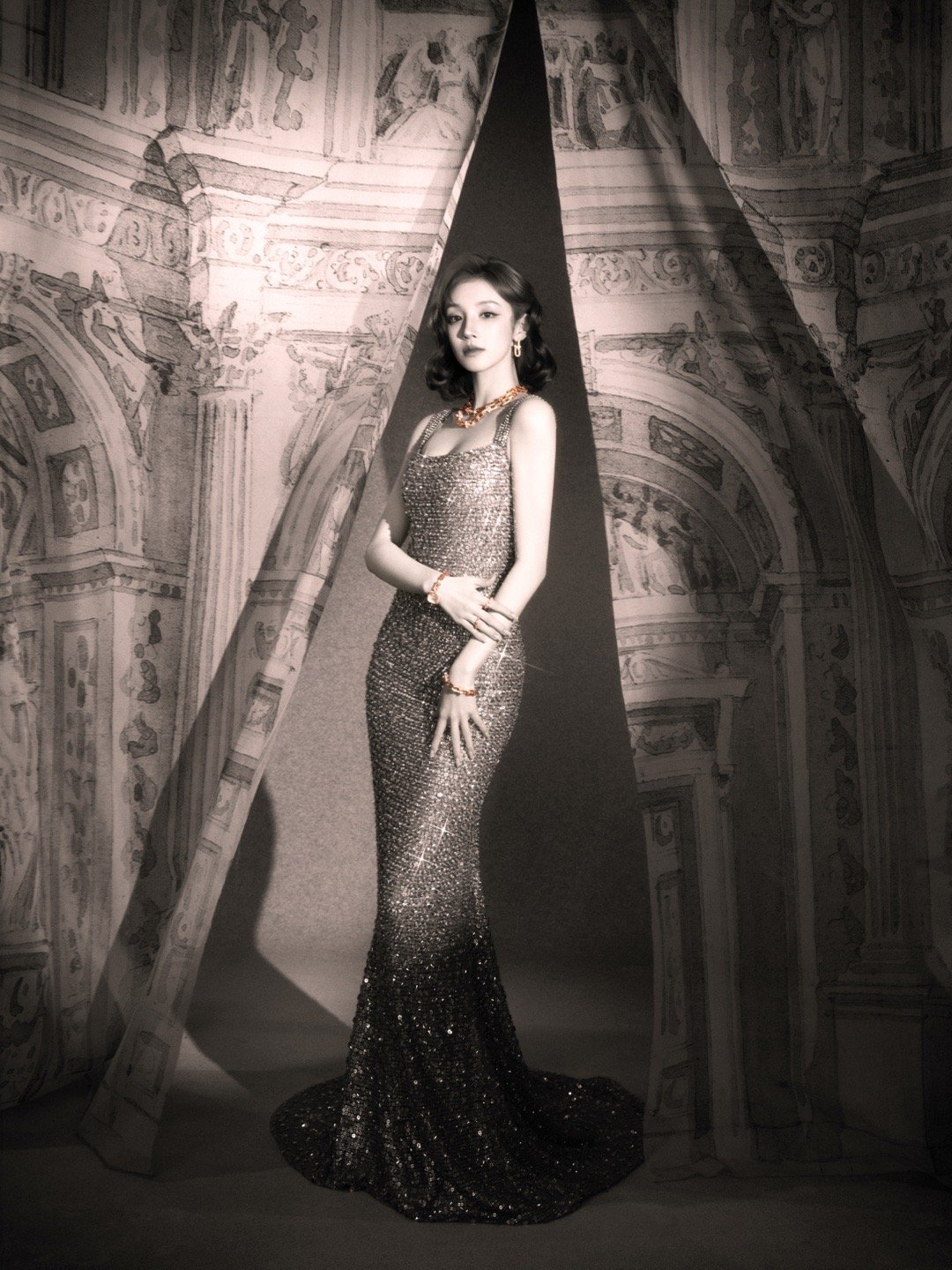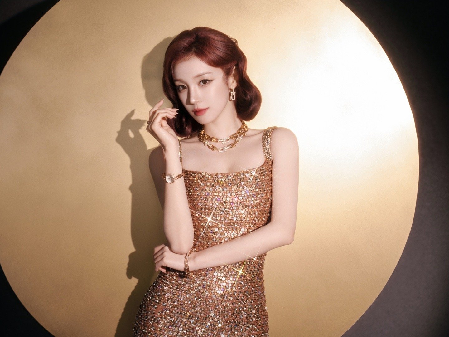 品牌大使雨琦一袭金色镶钻裙装搭配HardWear 系列亮相,复古光影下璀璨夺目的珠宝美人,好闪耀~✨
