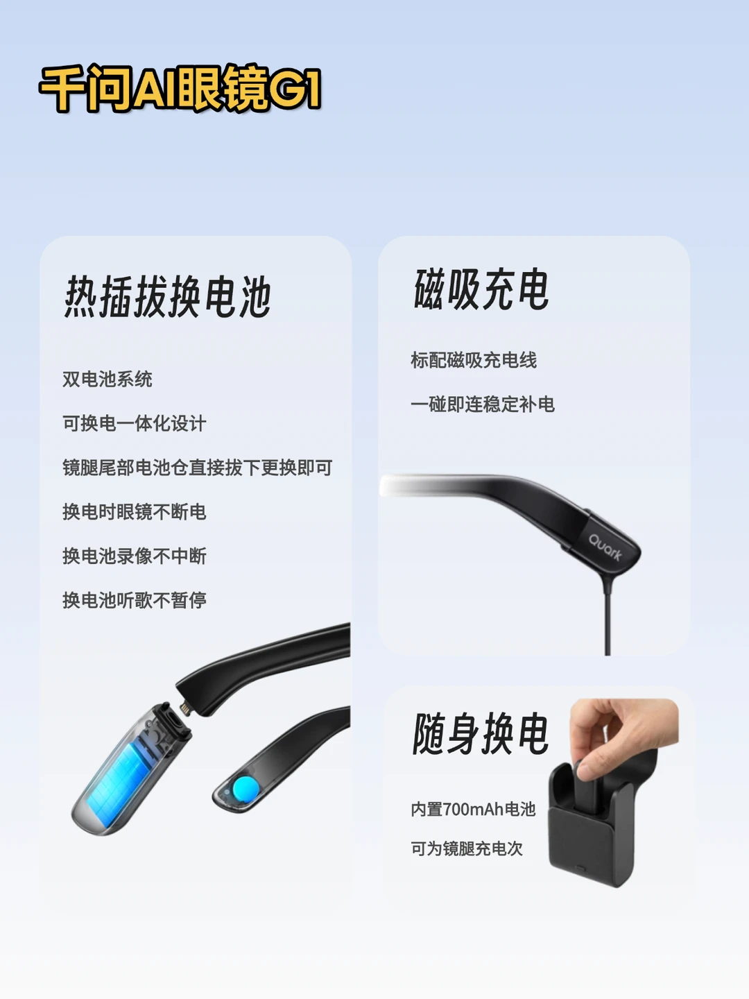 千问AI眼镜G1本体9个小时续航。支持热插拔技术,镜腿的电池仓直接拔掉换一个新的即可。