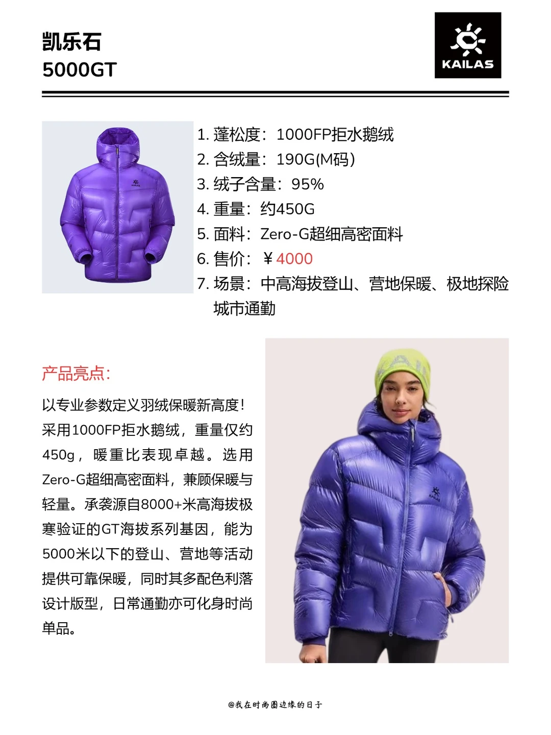 专业参数定义保暖新高度!1000FP拒水鹅绒,M码含绒量190g,绒子95%,重量约450g,实现了卓越的暖重比。面料选用Zero-G超细高密材质,兼顾保暖与轻量,并配备多样配色。承袭源自8000+米高海拔极寒验证的GT系列雪山羽绒基因,能为5000米以下的登山、营地等活动提供可靠保暖,同时其利落设计巧妙融合户外功能与城市潮流感,日常通勤亦可化身时尚单品。