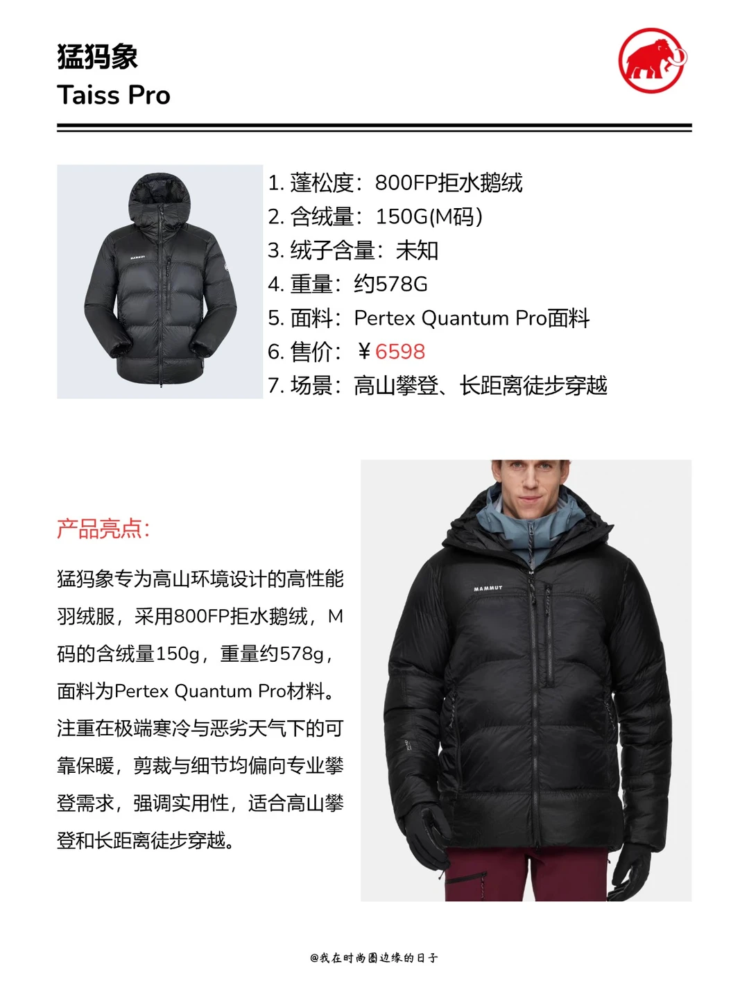 高山环境专属高性能选手!800FP拒水鹅绒,M码含绒量150g,重量约578g。Pertex Quantum Pro面料,极端寒冷+恶劣天气下保暖超可靠~剪裁细节偏专业攀登,实用性拉满,高山攀登、长距离徒步穿越闭眼冲~