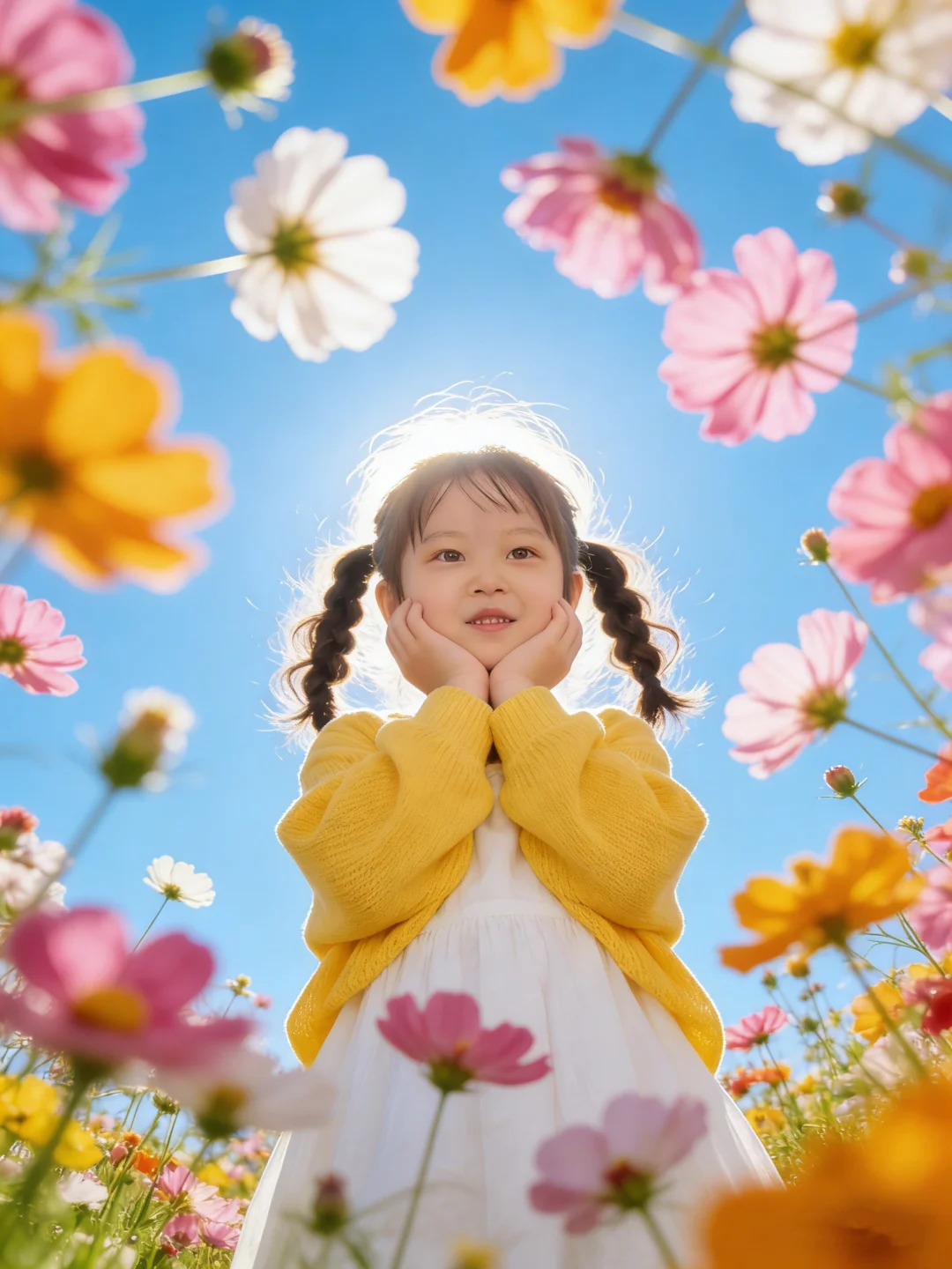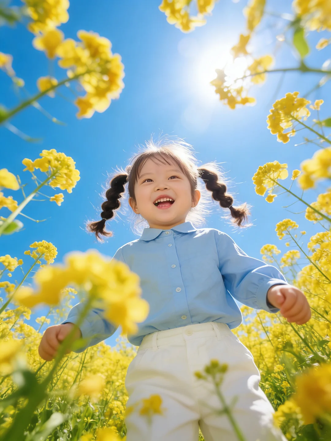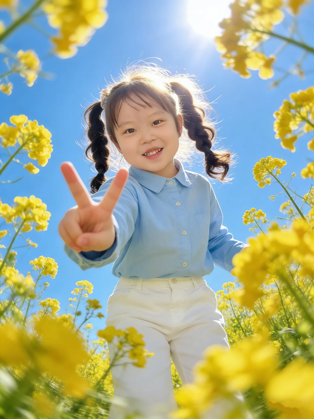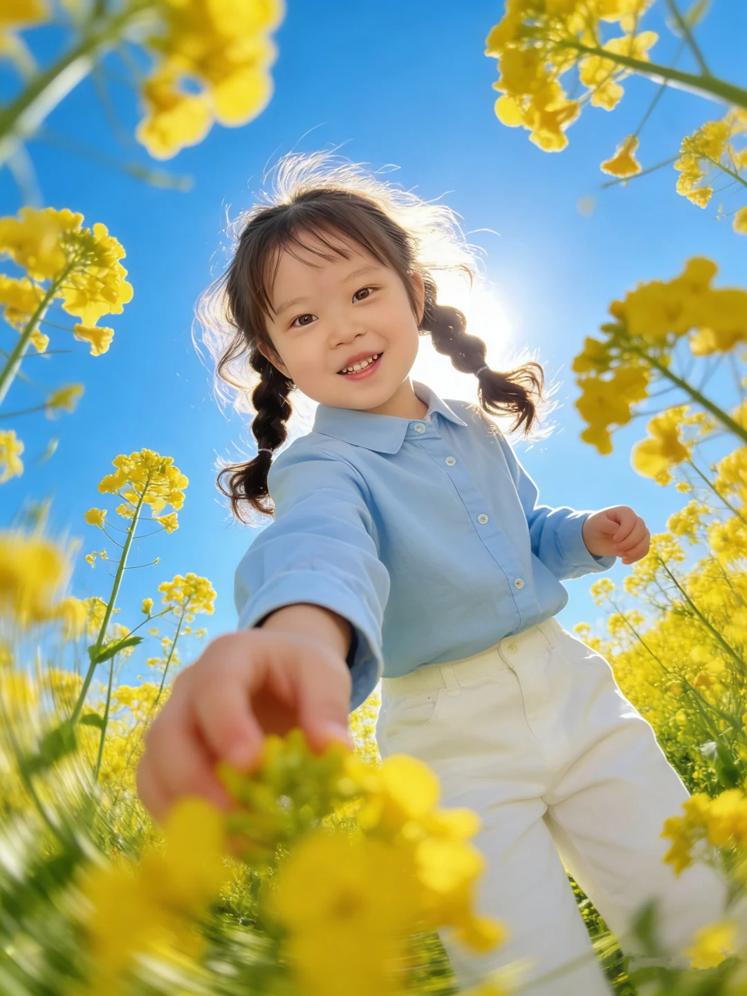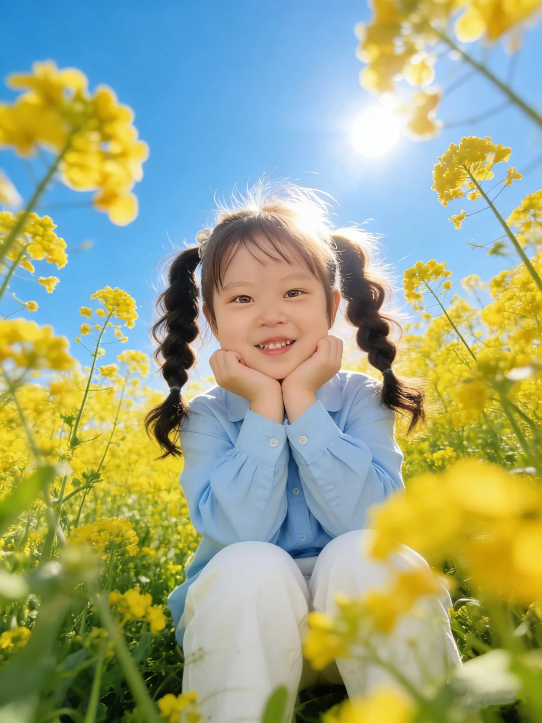 6岁小女孩,镜头在 油菜花 花丛里从下向上拍摄,花朵包围人物,蚂蚁视角。动态捕捉,拍出花丛随风自然摇曳的动态感,一位6岁甜美可爱的女孩,甜美可爱氛围感妆容,肉嘟嘟的小脸,童真可爱。穿浅蓝色长袖衬衫,白色裤子,各种可爱的动作,表情丰富,可以开心笑,眨眼睛,伸手、奔跑、闻花香等等,两个麻花辫微卷,前景花朵动态模糊,营造出随风飘动的感觉。背景是蓝色的天空,阳光明媚。朦胧美学,曝光补光,暖调画面尽显女孩的元气和可爱,比例3:4, 逆光照亮发丝, 轮廓光, 日系清新, 广角镜头,增加色彩饱和度和对比度。