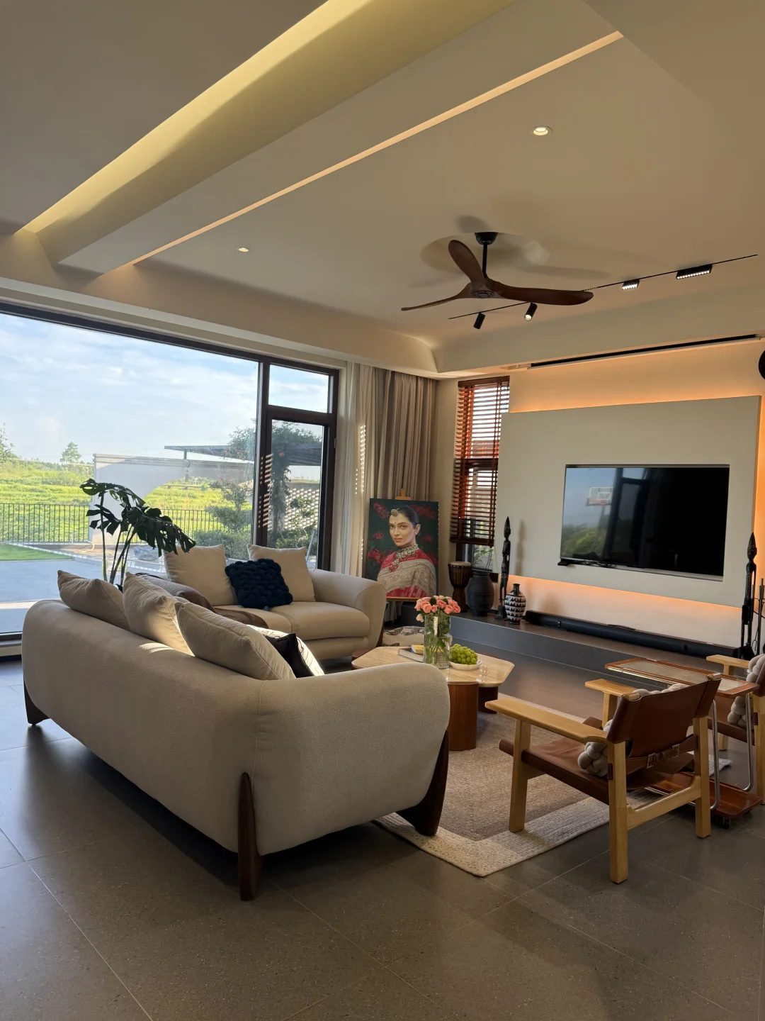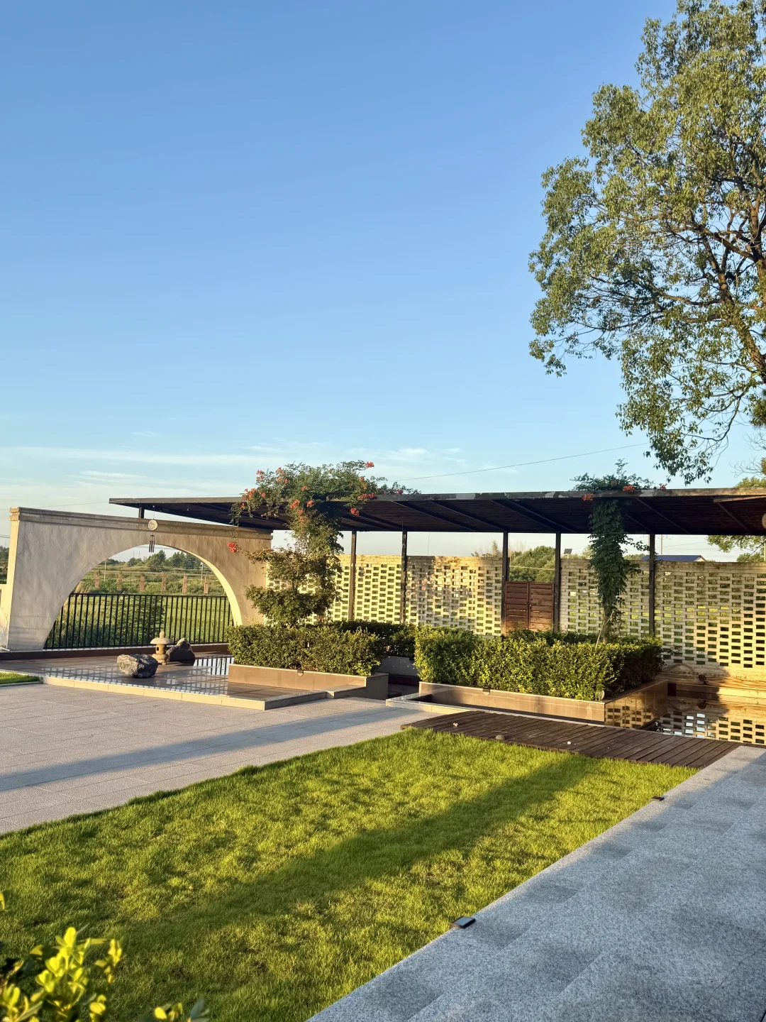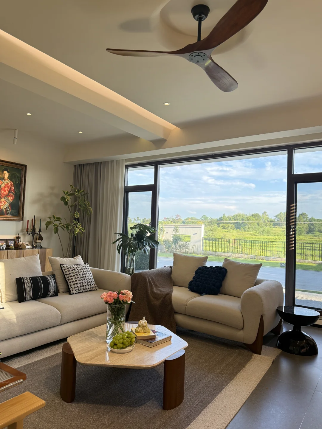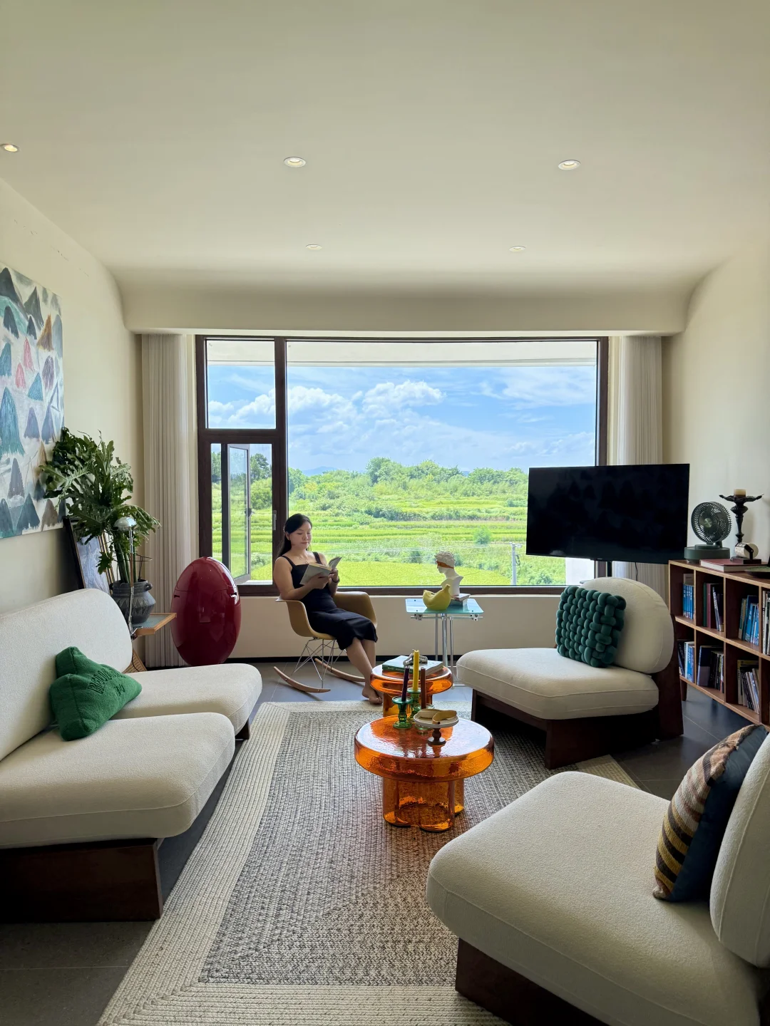 整个房子和院子的设计打破了农村自建房的传统设计,300平米院子一部分做了硬化和一部分做了庭院,保留了一部分做花园,没有做防盗窗,为了能更融入大自然,每间房做的大落地窗;没有传统的堂屋,一楼生活区域进来是前厅、餐厅和客厅,半封闭用装饰来做的隔断。