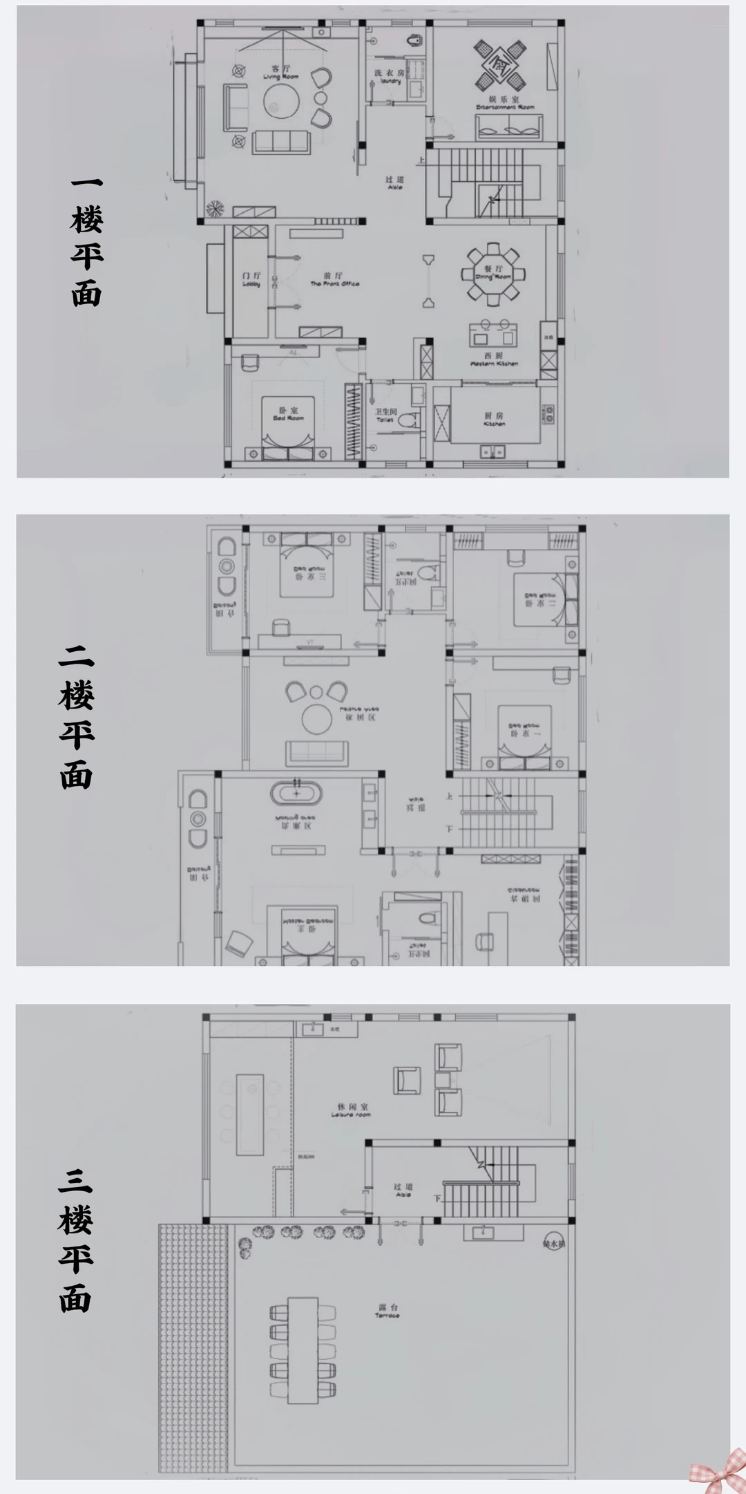 一楼是日常生活区域,二楼是我们的休息区域,三楼从主体上我们做半层的坡屋顶设计,用来做休闲娱乐的区域。