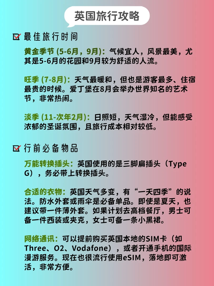 合适的衣物:英国天气多变,防水外套或雨伞是必备单品。