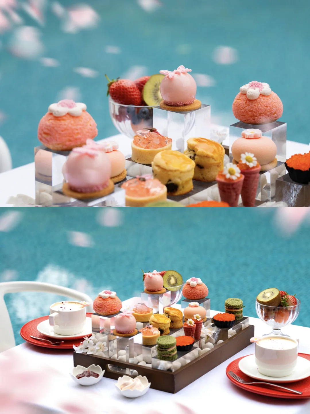 春天的浪漫全被这份388元樱花下午茶承包啦~一上桌就被狠狠惊艳!粉粉嫩嫩的琉璃樱花慕斯晶莹剔透,像把春日樱花锁进甜品里;樱花香草泡芙轻盈酥软,奶油绵密不腻;樱花草莓啫喱挞酸甜清爽,一口下去满嘴都是春天的气息。还有搭配樱花奶油草莓酱的现烤司康,松软奶香十足;樱花虾柑橘脆筒鲜爽开胃,咸甜平衡得刚刚好。咸口的烟熏牛肉三明治,一口下去肉香+吐司🍞奶香层次丰满咸香不腻!金玉蟹子挞金黄酥脆内馅鲜香,吃起来咸香浓郁酥得掉渣!再配上香醇咖啡、清爽果汁、温润花茶和精美的时令水果,与闺蜜边吃边聊边拍,温馨惬意氛围感拉满👍🏻