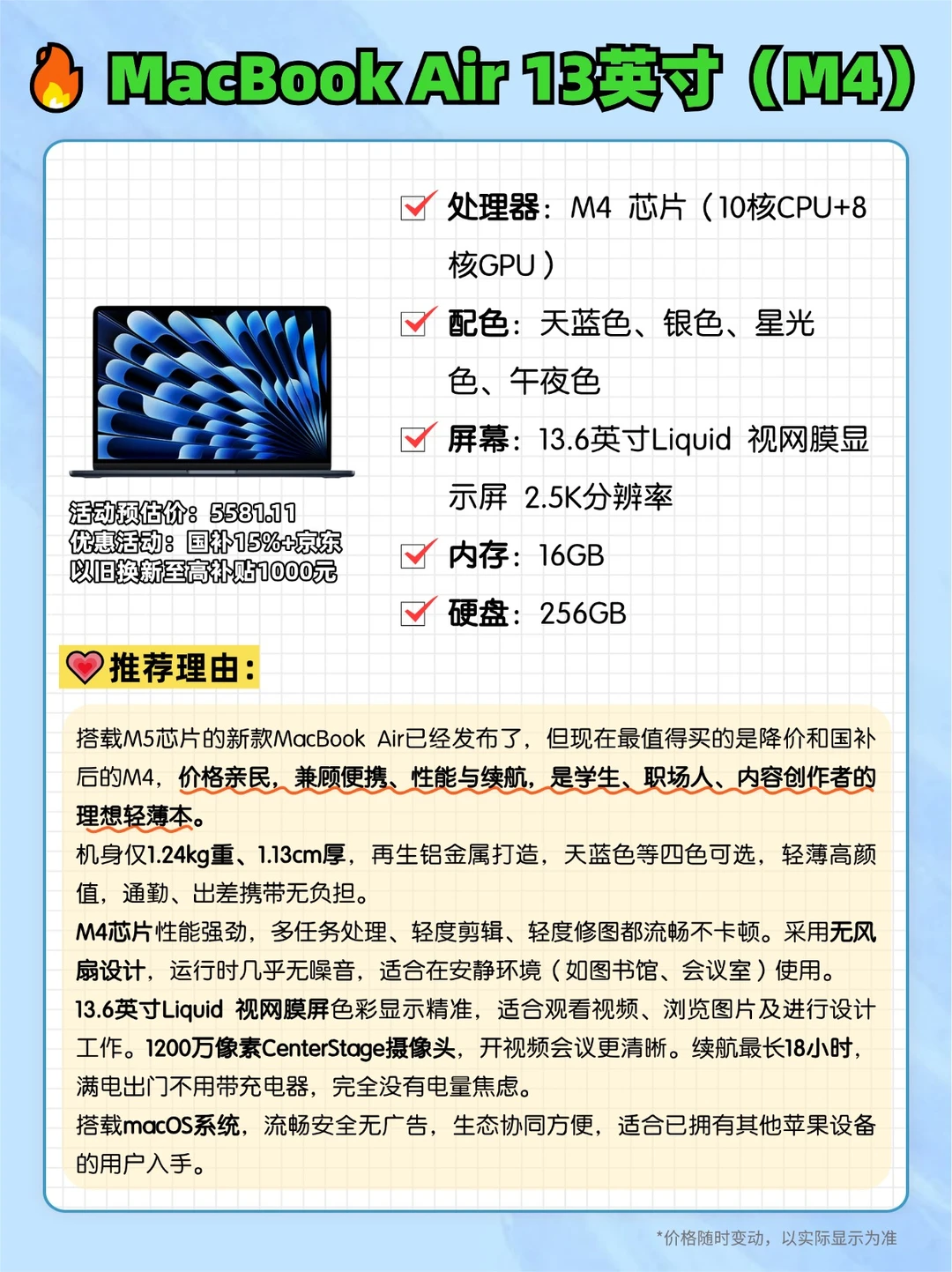 搭载M5芯片的新款 MacBook Air已经发布了,但现在最值得买的是降价和国补后的M4!京东入手还能以旧换新至高补贴1000元。