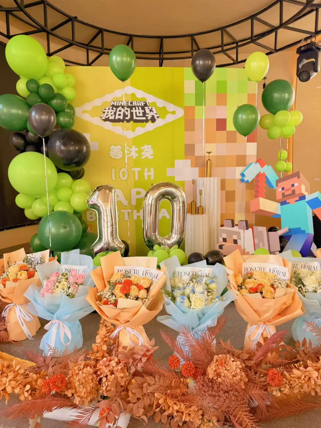 从主背景到气球装饰,每一处都是满满的像素风细节,连孩子最爱的史蒂夫都“穿越”到了现场,瞬间点燃全场氛围!