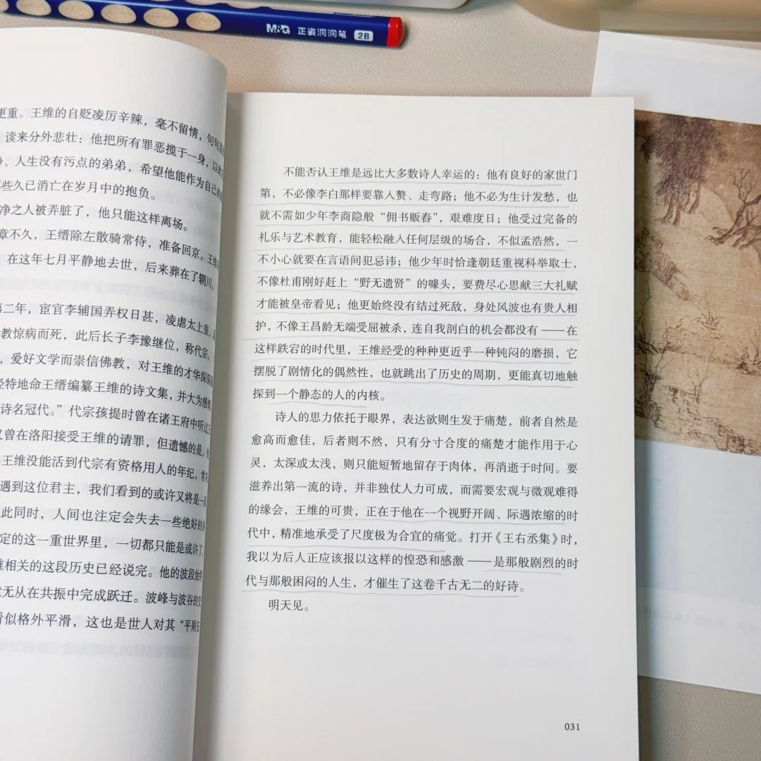 作者把他剖析的很全面,讲述他所处的时代、友人、情感、绘画、音乐、诗艺等。让我看到了他的努力和努力过后的痛苦,而后又慢慢归于平静的内心,但是!跳脱出来看,你就会发现通常很擅长自我疗愈的人,也意味着他本身很容易收到伤害,尤其是王维还懂艺术,一般情况下这类人内心又十分敏感。