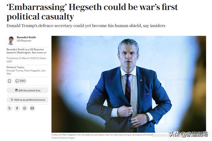 一些内部人士认为,特朗普可能在伊朗战争期间,利用国防部长皮特·赫格塞斯作为政治“人肉盾牌”。 赫格塞斯采取了最为强硬的公开立场——他接受采访,吹嘘自己击溃了敌人,并声称战争“才刚刚开始”。 与此同时,特朗普有时则采取更为温和甚至自相矛盾的语气,暗示冲突可能很快就会结束。 前官员表示,这种对比可能是有意为之:如果战争不得人心或进展不顺,赫格塞斯将承担所有批评,从而在政治上保护特朗普。 来源:《每日电讯报》