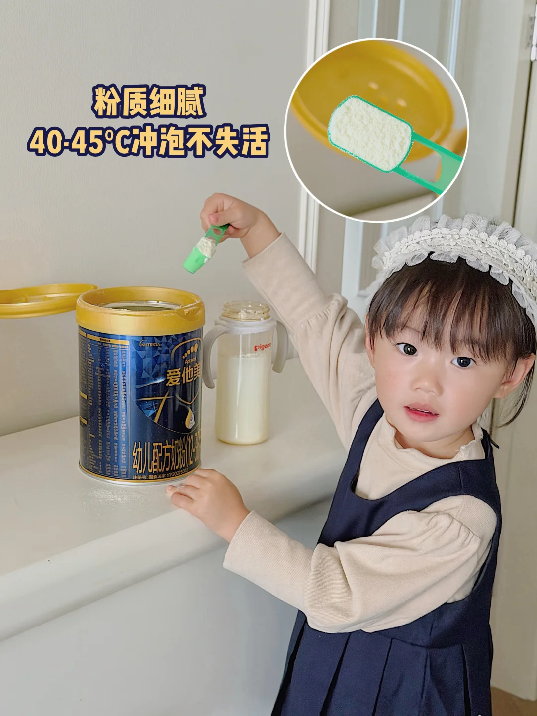 现在我家姐姐也一直在喝,每次冲调先加水后加粉(40-45℃温水),轻晃溶解不结块,宝宝喝着不呛奶、不吐酸水,每天状态稳稳的睡得香~