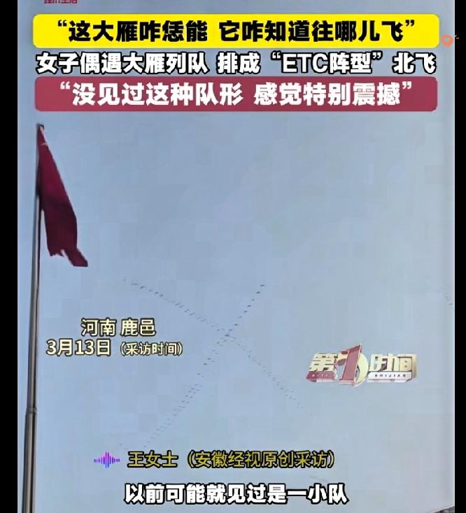 河南家长接孩子时抬头惊掉下巴,大雁北飞居然排出“ETC阵型”,错落有致的小队像极了高速扣费通道,在场人都举着手机狂拍! 以前只见过大雁排“人”字或“一”字,为的是节省体力长途迁徙,可这群大雁直接玩起新花样。 前面一队稳稳走“一字”领航,后面几队整齐列队,线条规整得像人工规划,网友调侃“这是急着去北方扣暖气费?” 其实大自然从不是按常理出牌的“老古板”,生灵们的默契配合藏着生存智慧,偶尔还会用这种巧合给人类送惊喜。 我们总忙着低头赶路,却忘了抬头就能撞见自然的浪漫。 你还见过哪些大自然的“神来之笔”?