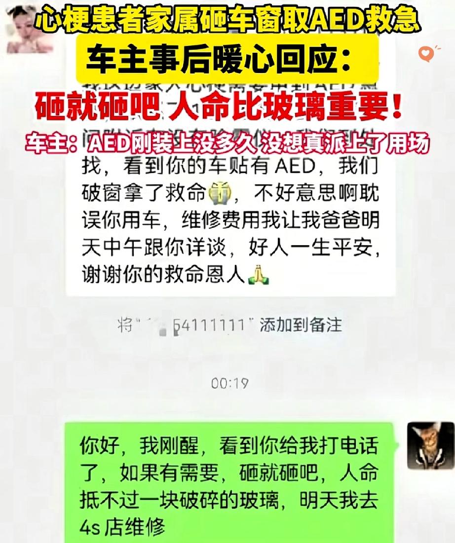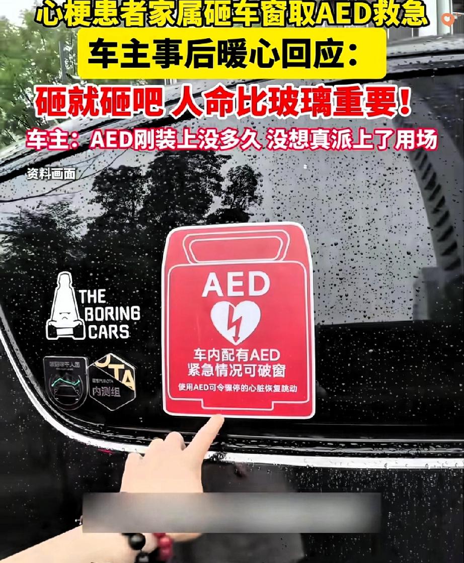 格局炸裂! 山东威海这一幕太暖了! 家人突发心梗急需AED,家属找不到车主,果断砸破保时捷车窗取用,车主一句话让人破防:“砸就砸吧,一块玻璃抵不上人命!” 原来车主李先生是自费1.2万装的AED,还特意标注“紧急情况可破窗”,就盼着能帮上陌生人。 要知道我国每年55万人心跳骤停,黄金抢救就4分钟,AED这“救命神器”操作超简单,记住“开、贴、插、电”非专业也能上手。 李先生刷视频懂了它的重要性,自掏腰包装车,这份远见真的救了人。 这事儿不只是善意,更戳中了AED普及的痛点——现在不少地方还缺这设备,有人想救却没工具。 车主的通透和家属的果断,是给社会上了堂急救课:救命优先,善意兜底。 家属事后主动赔偿,却被他婉拒,这份通透真的太难得。 这哪是简单的“让渡”,分明是两个陌生人对生命的敬畏撞了个满怀。 法律给紧急避险兜底,而人心的善良,让冰冷的规则有了温度。 其实最动人的社会模样,就是有人敢为生命冒险,有人愿为善意包容。 如果是你遇到这种情况,会果断出手吗?