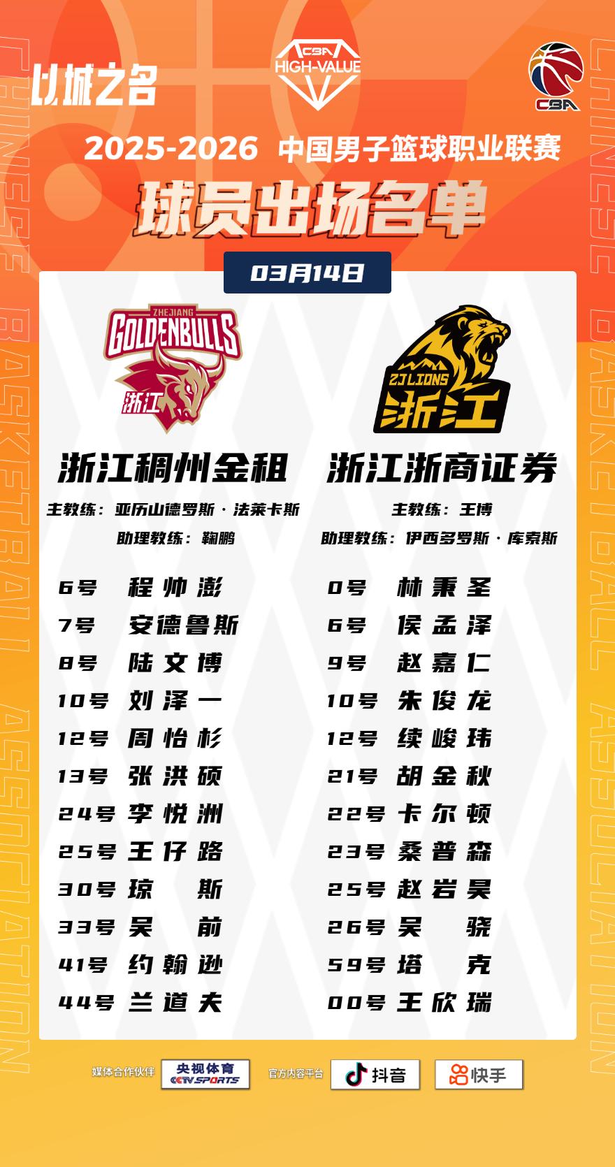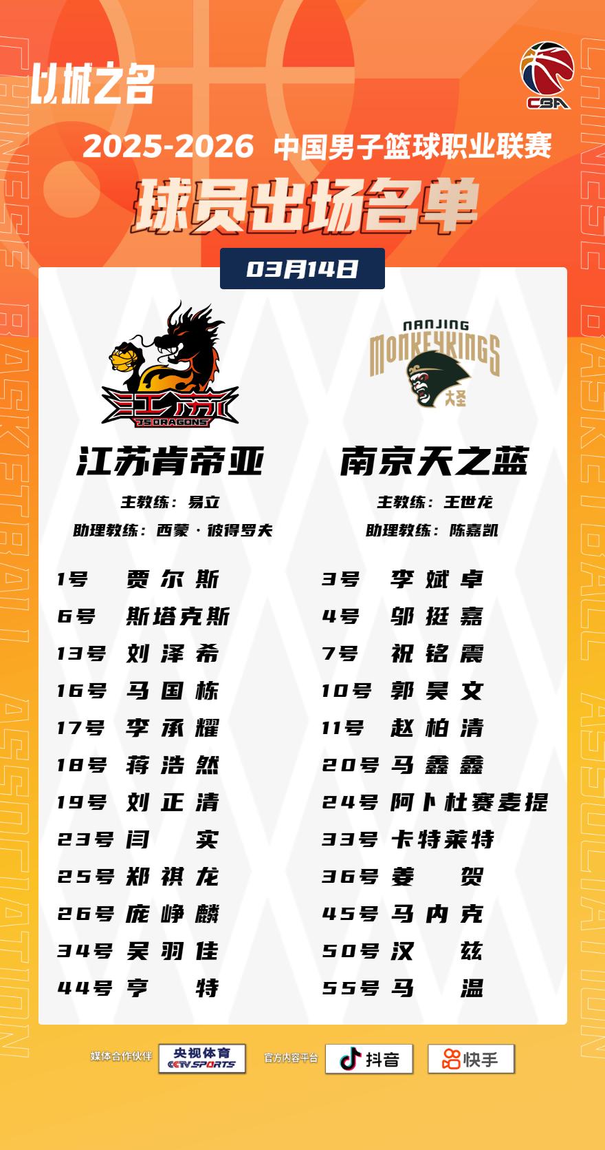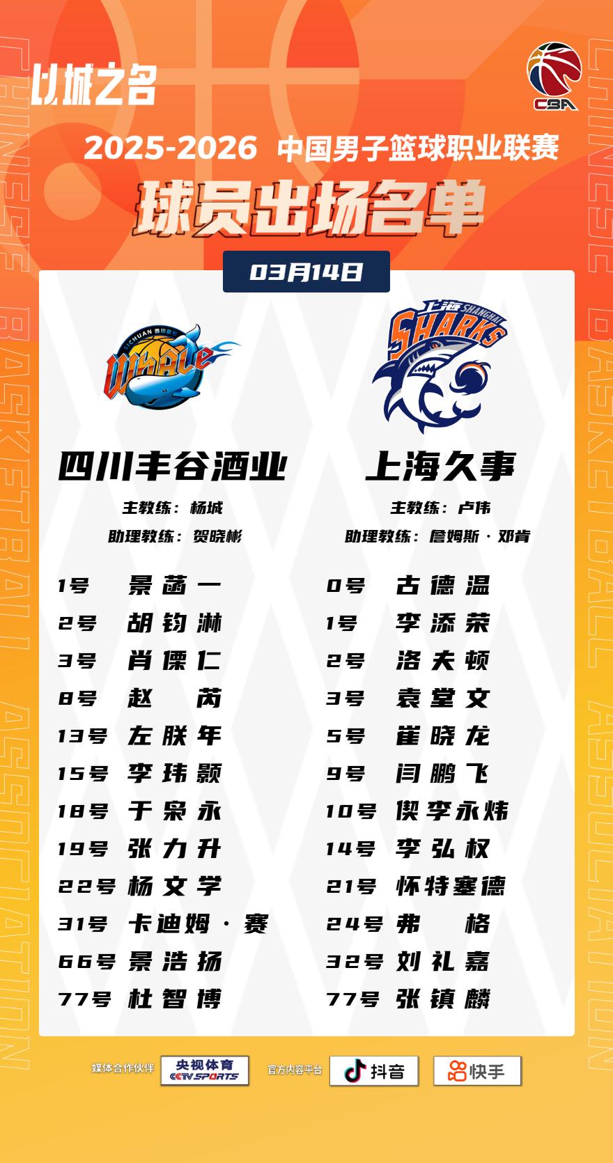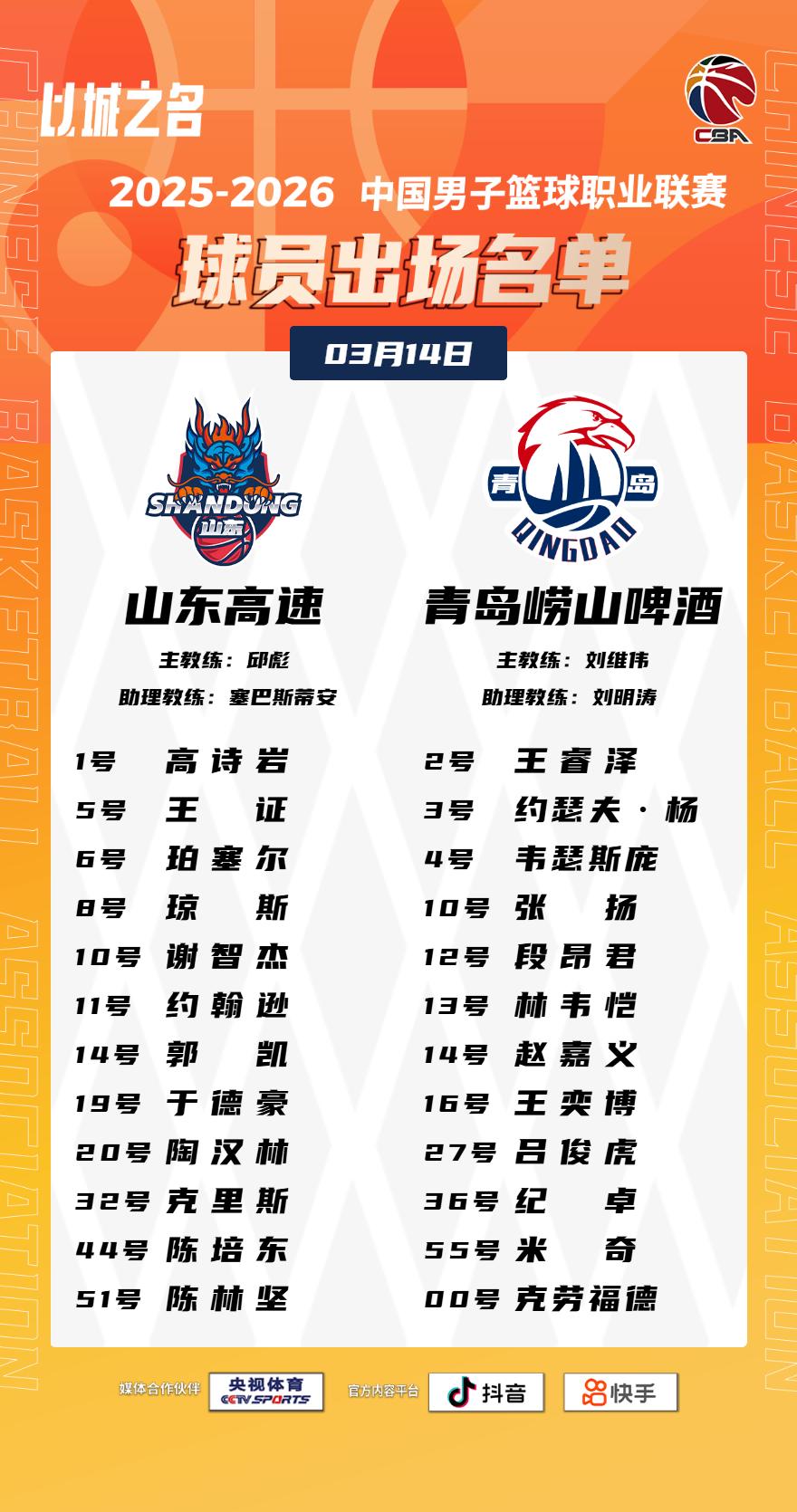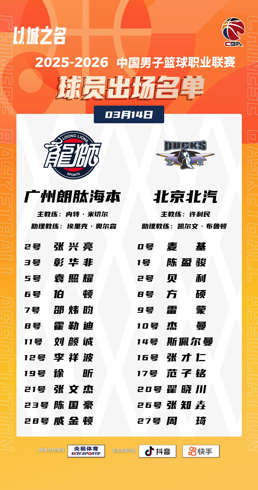 【大名单出炉】2025-2026赛季CBA联赛常规赛第二十五轮今晚继续进行,6场比赛将在19:35同时跳球。敬请期待!以城之名 竞由新生