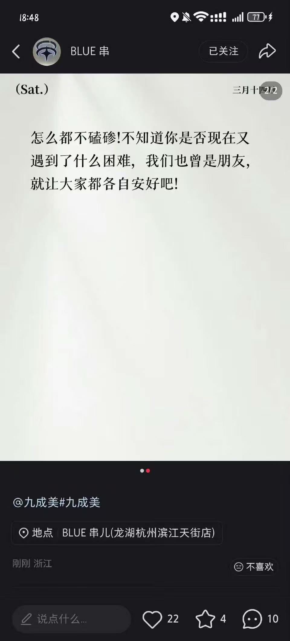 田栩宁朋友喊话九成美田栩宁朋友发声 田栩宁这朋友是不是蠢,粉丝洗了半天说是ai,结果现在出来发声了,喊话九成美各自安好吧……粉丝头像 嫂子拍的
