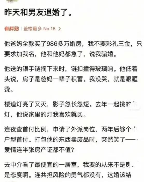 现在的谈婚论嫁,更像是两个公司合并前的财产清点...算明白了,强强联合,有分歧了,分道扬镳。 上海小情侣因婚房加名闹崩,女方一句“要的是态度”引爆全网!男方父母掏空家底全款986万买房,女方坚持加名被拒,果断退婚。 这到底是安全感缺失,还是算盘打得太精?说实话,女方的委屈能理解。婚姻里谁不想要个保障?但男方的恐慌更真实!父母一辈子的血汗钱,万一婚姻有变,半套房就没了。这场争执里,没有绝对的坏人,只有赤裸裸的现实碰撞。 这因为这种谈不妥的现状愈演愈烈,所以就要有一种力量下场背书。很多人不知道,2025年新婚姻法司法解释早已明确。婚前全款房,就算加了名,离婚时也不一定对半分! 法院会看实际出资,婚姻长短,家庭贡献。也就是说,加名只是个入场券,能分多少,还得看婚后你为这个家付出了多少。 所以,姑娘们,别再把加名当成唯一的护身符。真正的安全感,从来不是半张房产证,而是自己赚钱的能力和对方不离不弃的决心。小伙子们,也请理解那份不安,婚姻不是买卖,更不是赌博,但尊重彼此的底线才是长久之道。 这场退婚,没有赢家。在爱情里谈钱不丢人,但只谈钱,婚姻这座大厦的基础,已经塌了。