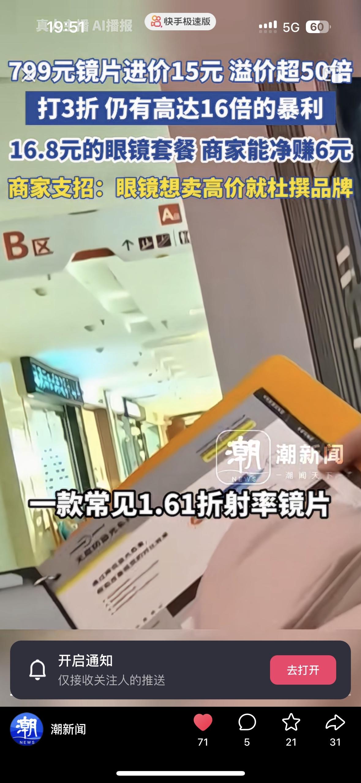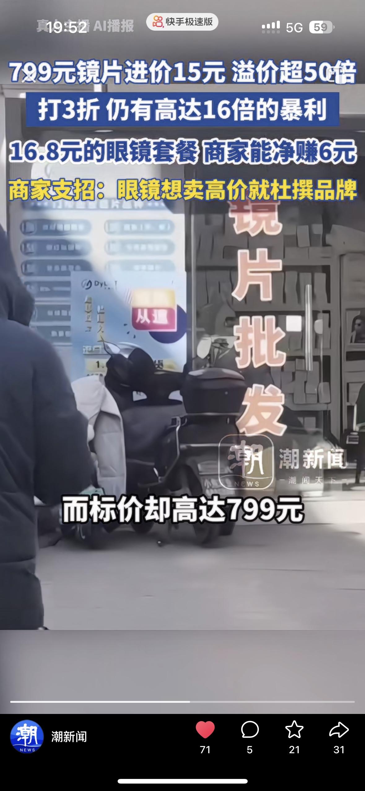 太炸裂了!799元的镜片进价居然只有不到20出头,商家这跟抢钱有什么区别啊 谁能想到一副眼镜的成本只有十几块钱,售价却高达800多,溢价超过50倍! 镜架的套路更是触目惊心:25元的普通镜架,贴个听着洋气的“进口品牌”标签,转身就能卖到上千元;成本150元的钛合金镜架,门店标价直接飙到2000+,利润翻了十几倍。就连16.8元的“平价配镜套餐”,商家都能净赚6元,一副成镜的真实成本低到只有11元,简直是把消费者当“冤大头”。 眼镜明明是人人离不开的刚需品,却在层层加价和虚假包装下,成了不折不扣的“暴利重灾区”。商家靠杜撰品牌、虚标功能收割普通人,把十几块的成本炒到几百上千,吃相难看到了极点。 别再被“进口”“防蓝光”“智能变焦”这些噱头忽悠了!配镜前先查产地、问清成本,别让自己的辛苦钱,白白填进眼镜行业的暴利黑洞!