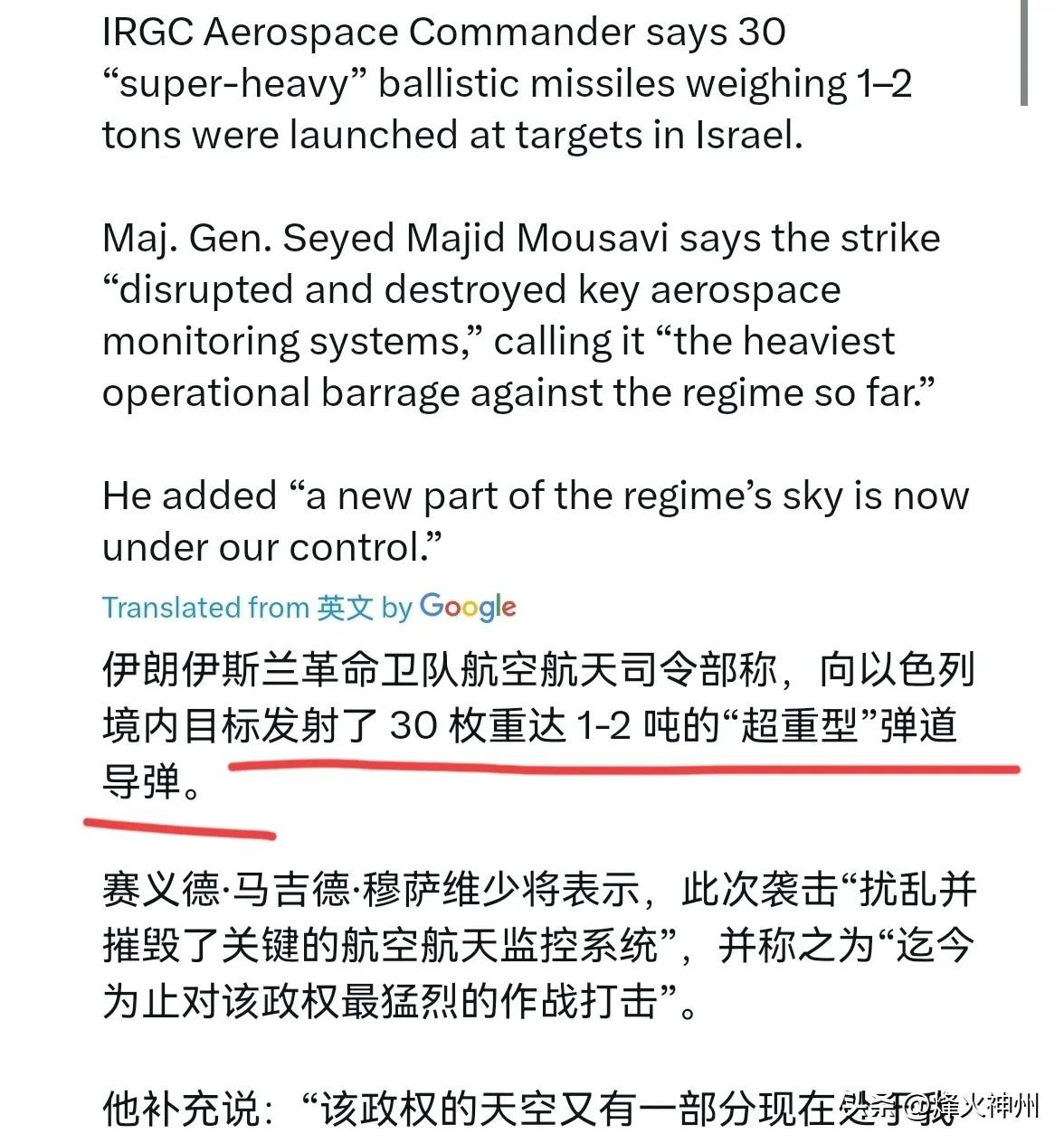 3月14日,伊斯兰革命卫队航空指挥官赛义德·马吉德·穆萨维少将表示,30枚重达1-2吨的“超重型”弹道导弹向以色列境内的目标发射。这次袭击的目的是扰乱并摧毁了关键的航空航天监控系统,而这是迄今为止对该政权最猛烈的打击。 评几句: 伊朗伊斯兰革命卫队以30枚超重型弹道导弹直击以色列核心监控系统,打出近年来最强力度打击。一直被捧为“天衣无缝”的防御体系,在饱和打击下瞬间破防,充满讽刺意味。 长期以来,凭借域外支持与先进装备,以色列在地区内频频采取行动,将自身安全建立在对他人的压制之上,可伊朗此番直戳要害,彻底戳破了看似坚固的安全神话。 不宣而战的是它,喊着安全的也是它;习惯压制的是它,遭遇重击的还是它。伊朗用行动说明,一味依靠威慑与挑衅换不来安宁,靠外部撑腰更筑不成长久防线。 这场打击不只是军事上的反击,更是对单边傲慢的当头一棒。中东的和平从不是强权说了算,压迫与对抗只会换来更猛烈的回应,所谓安全神话,终究抵不过现实的回击。